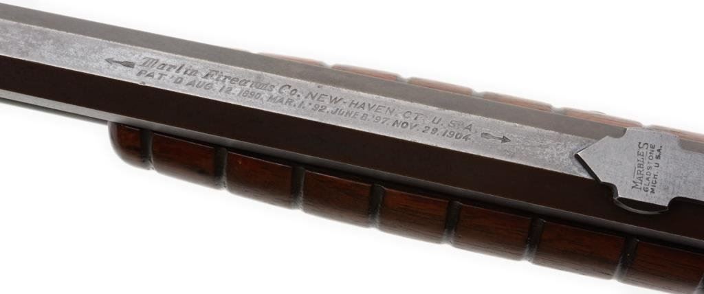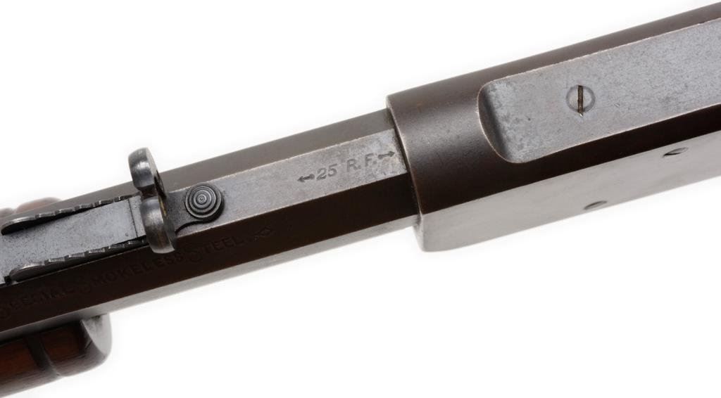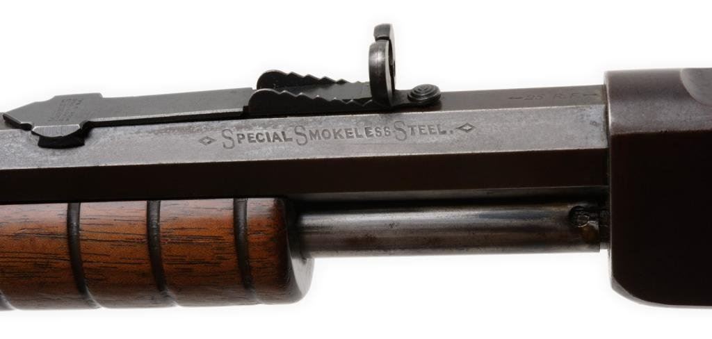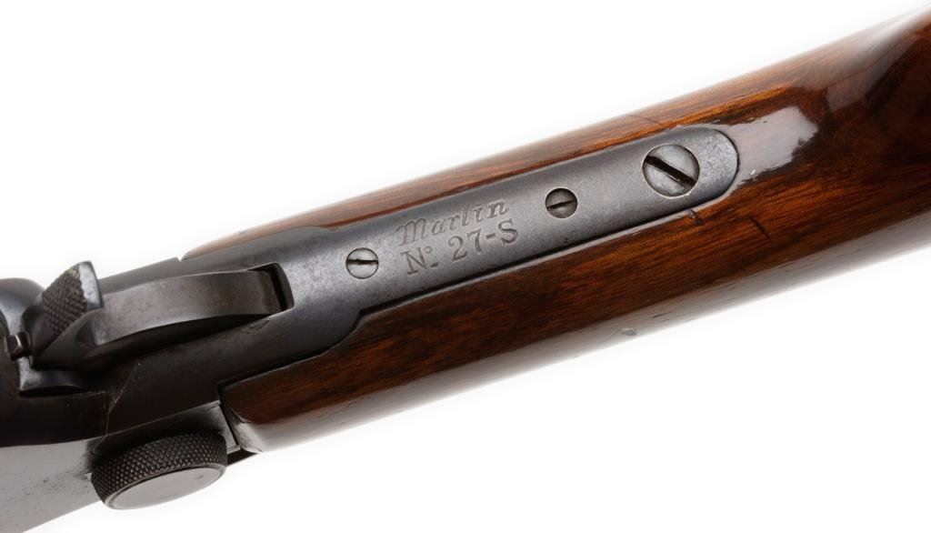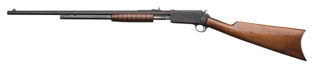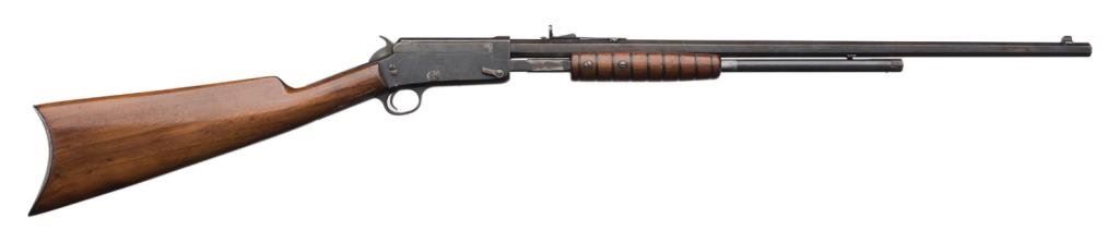 *Marlin Model 27-S Take Down slide action rifle, .25 cal., serial #NSNV. The rifle is in overall good to very good condition with a 24” octagon barrel, ½ magazine, ramp front and adjustable buckhorn rear sights. The barrel and magazine retain the majority of their thinning blue finish with the barrel showing sharp edges. The receiver is drifiting to a pleasing patina with some mild surface erosion evident on the right side. The smooth wood stocks are in very good condition with small mars and compressions consistent with field use and a metal crescent butt plate. The bore is very good, the action crisp and markings are sharp. Est.: $350-$500.