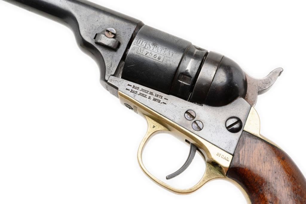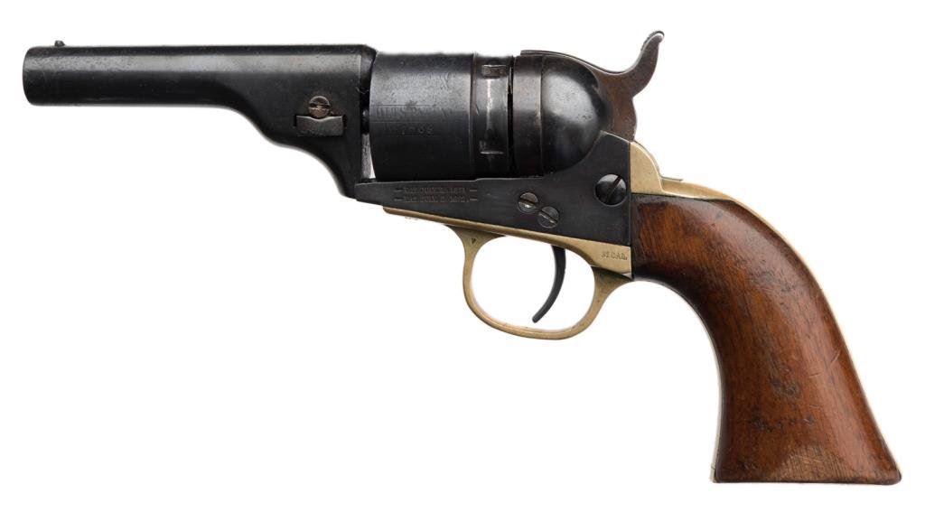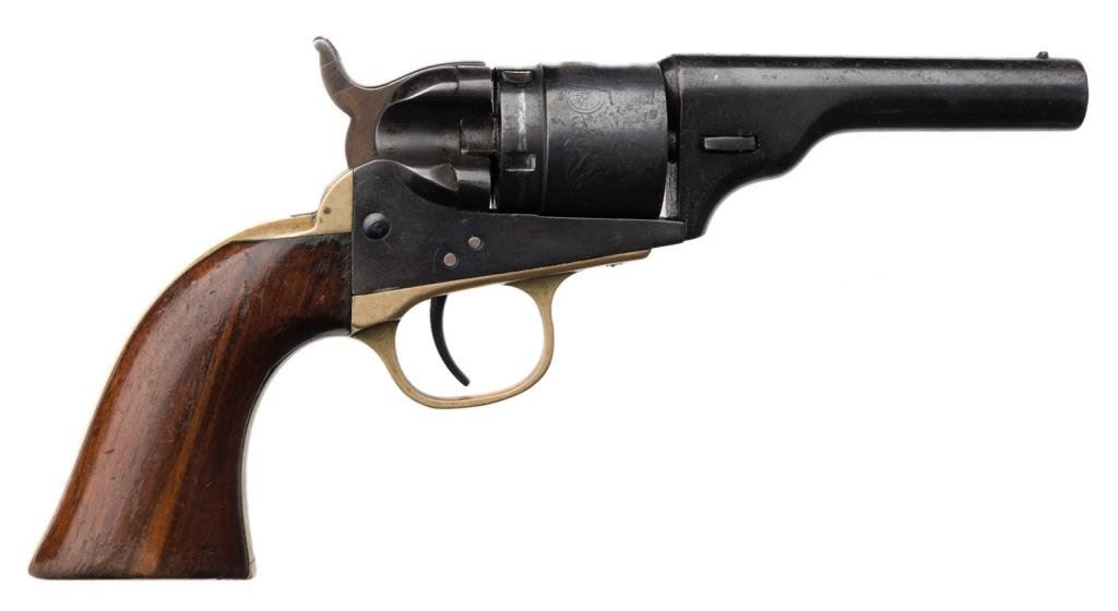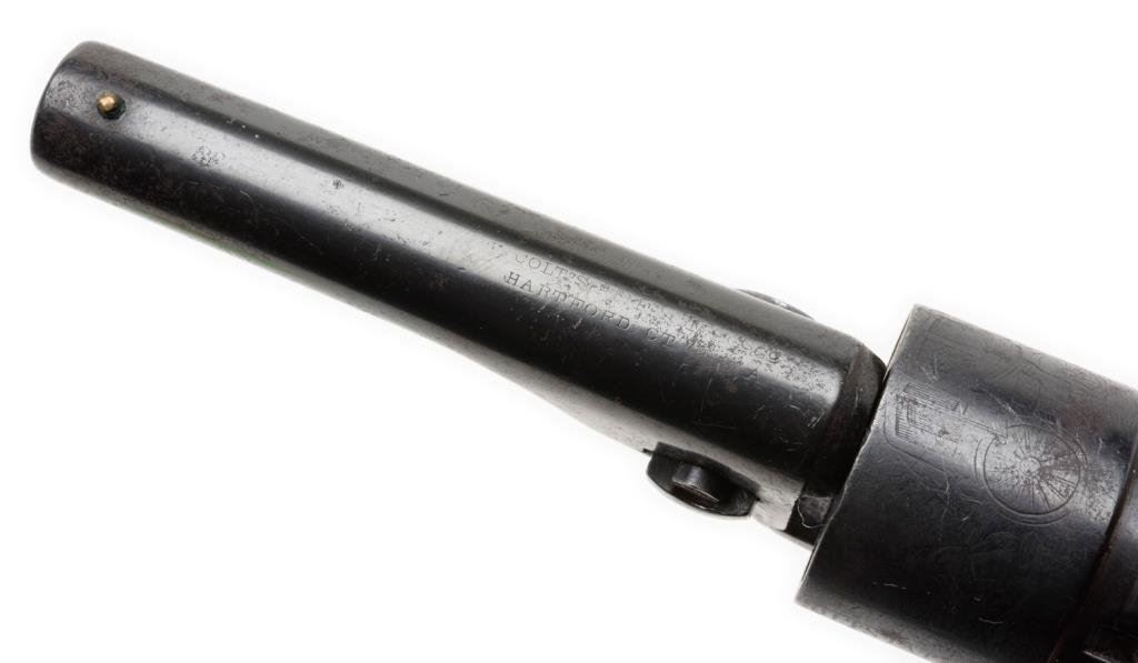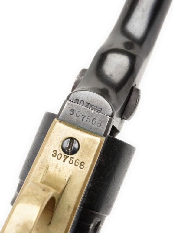 Colt Pocket conversion revolver, .38 caliber, 3,5” round barrel, S/N 307568, matching visible numbers, re-blued finish, wood grips in overall fair to good condition as re-finished; action needs repair. Est.: $400-$800.