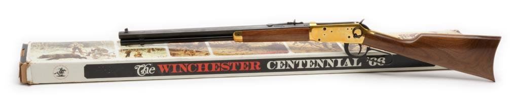 *Winchester Centennial 66 Commemorative lever action saddle ring carbine, .30-30 caliber, 20” octagon barrel, S/N 13599, two-tone finish, wood stocks in overall excellent condition showing little handling; accompanied by a factory cardboard box and cover sleeve. Est.: $350-$700.