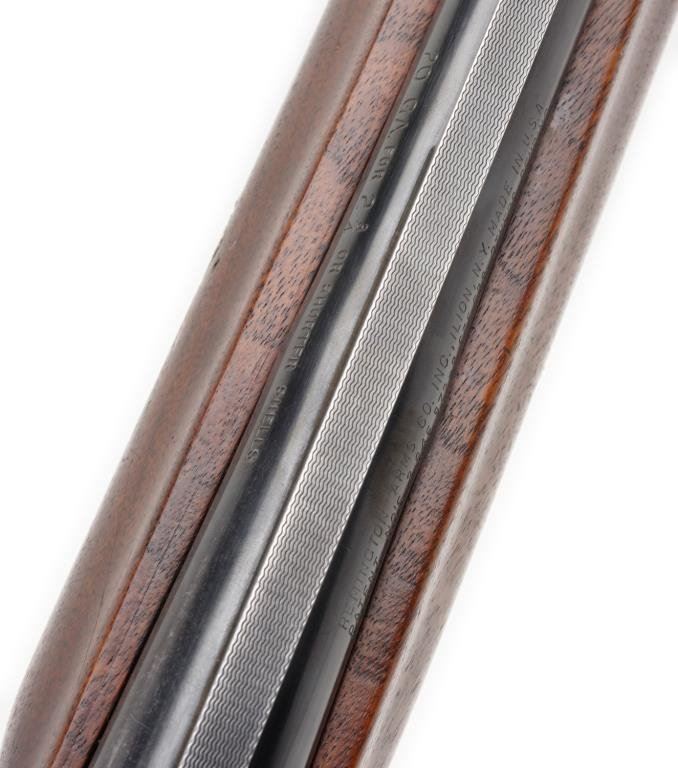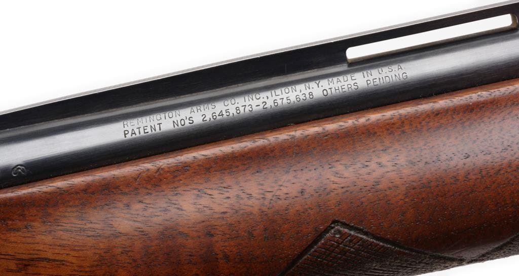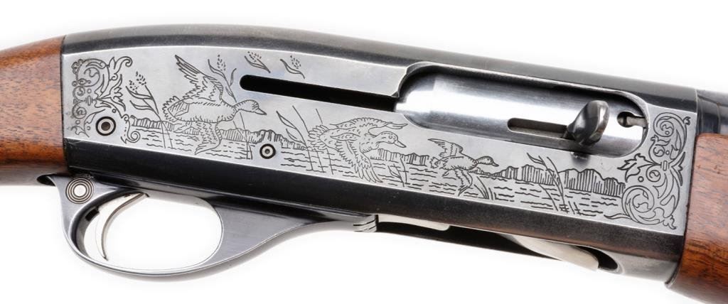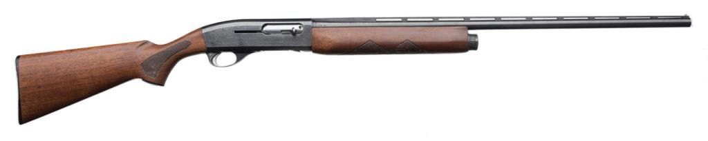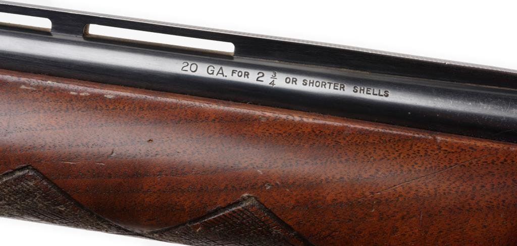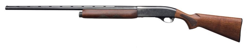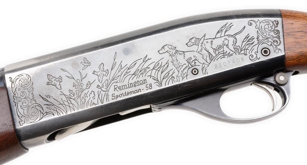 *Remington Sportsman 58 semi-automatic shotgun, 20 gauge, 27.5” ventilated rib barrel, ornamented receiver, S/N 220240X, blued finish, checkered wood stocks; good action, wood shows transfer “fuzz” from being in a boot; barrel has bulge approximately 4” from the breech. Est.: $300-$600.
