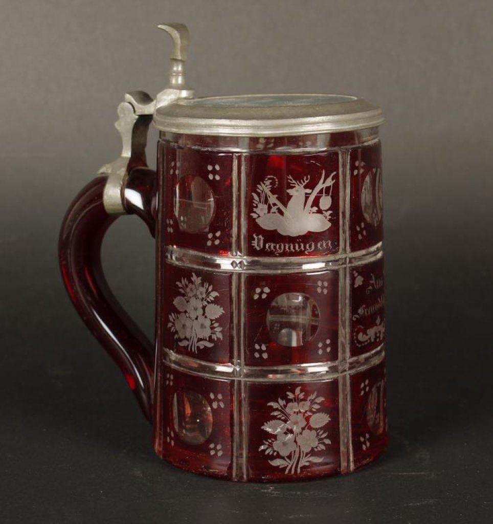 Lot 3179 German stein; “Ruby Red” cut/etched glass with pewter glass top. Est.: