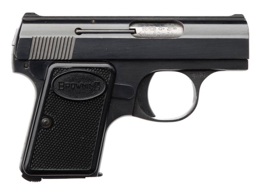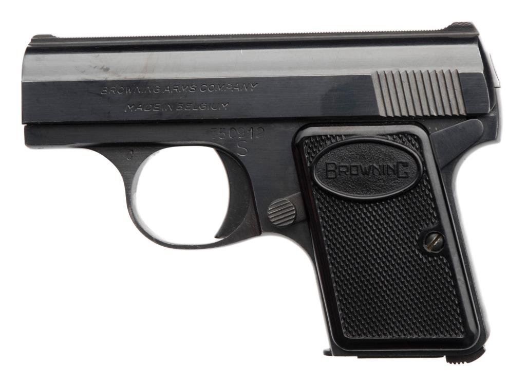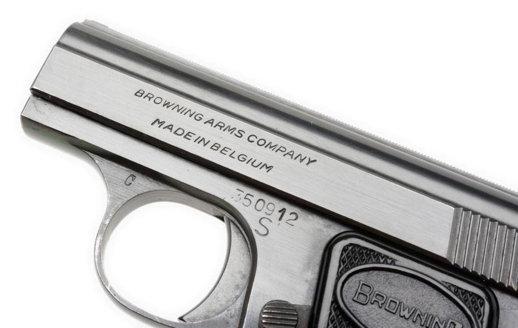 Belgian “Baby Browning” .25 auto, SN: 350912S with Browning zipper case. Made 1966. 95%-98% with slight marks on the sides of trigger guard and minor carry. Est.: $400-$800
