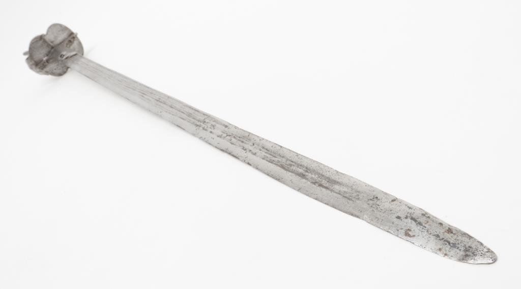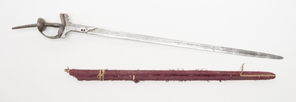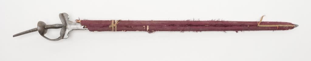Indian long sword (Khanda) with scabbard. 18th century with good forging. The scabbard shows losses and aging. The sword measures 50” overall with a 38” blade. A real fightning weapon from Mogul era. Est.: $400-$800