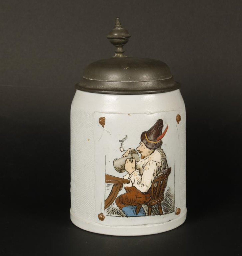 Metlach drinking stein, approximately 6” tall, #1646 tapestry type inlaid lid “man Drinking”. Est.: $100-$200.