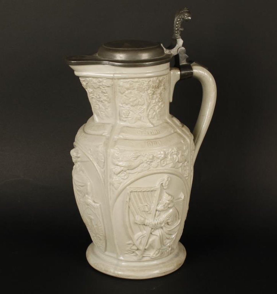 Large 1.5 Liter German stein relief type, 3 panel, Joan of Arc with sword; pewter top; #6. Est.: $100-$200.