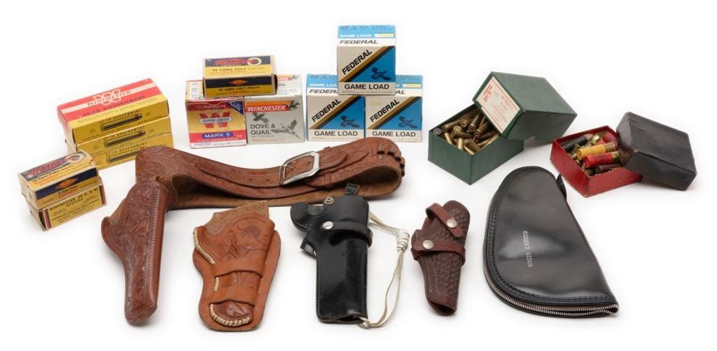 Misc. lot of collector ammunition including 3 boxes of Winchester .45-70, 1 box of .38 Special, 1 box of .38 Super police, 5 boxes of 20 gauge shotgun ammo , misc. cartridges and a tooled Mexican leather holster/belt rig. Est.: $100-$200.