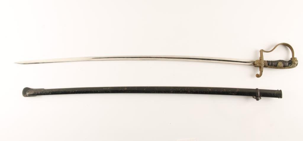 Nazi Officer’s sword with scabbard. Lion head pommel with jeweled eyes. Good condition. No makers mark. Est.: $150-$300