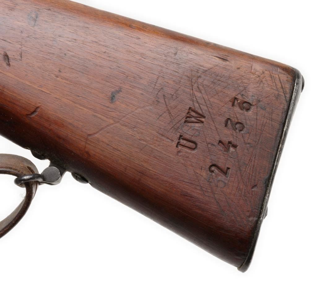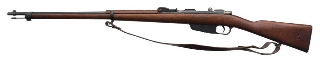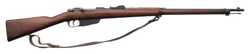 Carcano 1896 bolt action rifle, 6.5mm caliber, 31” barrel, S/N UW2433, blued finish, wood stock with leather sling in overall good condition. Est.: $100-$200.