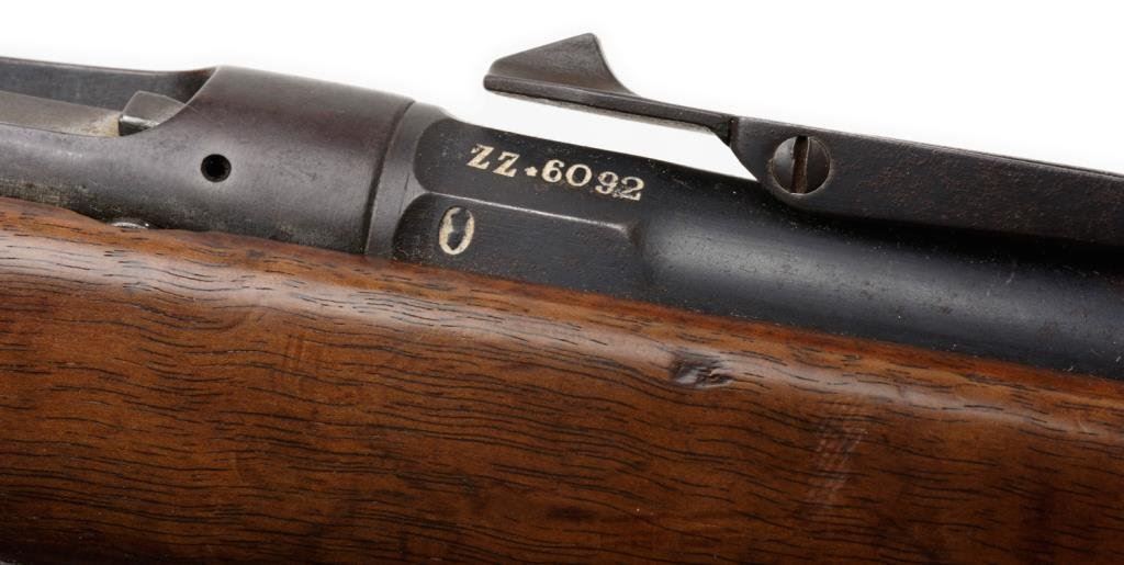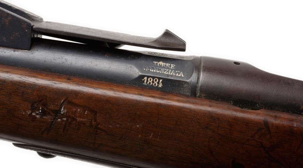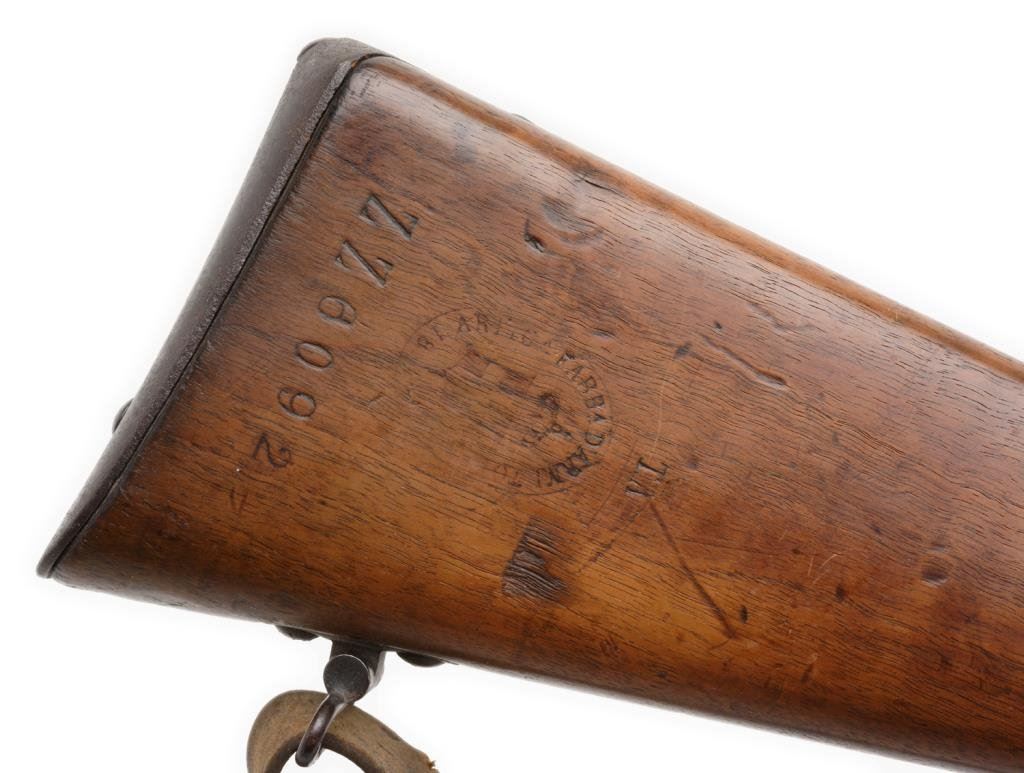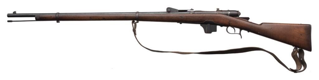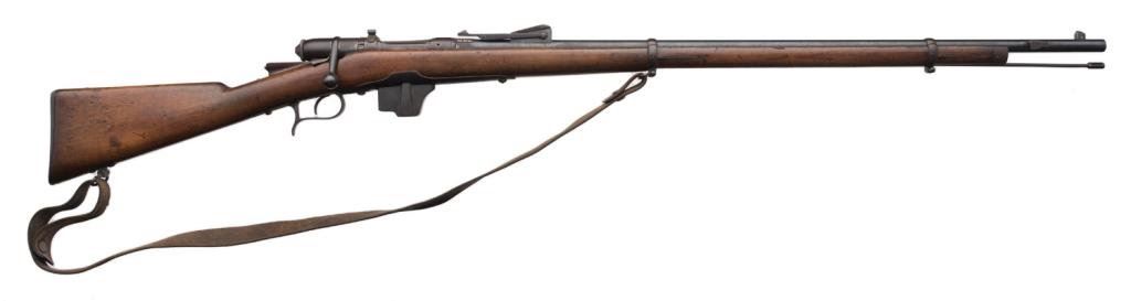 Vetterli 1884 bolt action military rifle, 10.4 x 47mm caliber, 34” barrel, S/N ZZ-6092, blued finish, wood stock, leather sling in overall good condition. Est.: $100-$300.