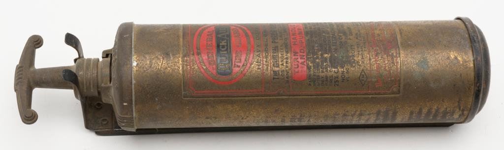 Old brass QuickAid fire extinguisher with wall bracket, approximately 13” long. Est.: $25-$50.