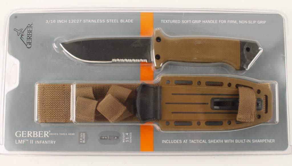 Gerber LMF II Infantry knife and tactical sheath with built-in sharpener and woven strap; like new in un-opened factory clear case. Est.: $50-$75.