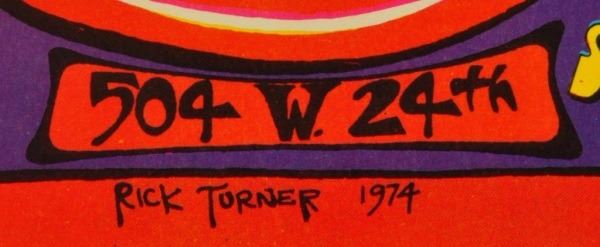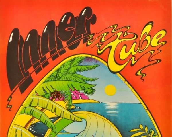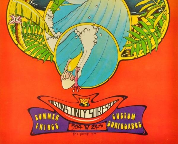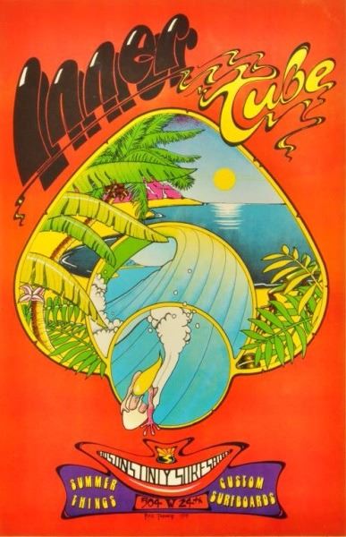 1974 poster advertising The Inner Tube Surf Shop. "Austin, Texas' only surf shop" Artist: Rick Turner. Linen backed. 11" x 17".