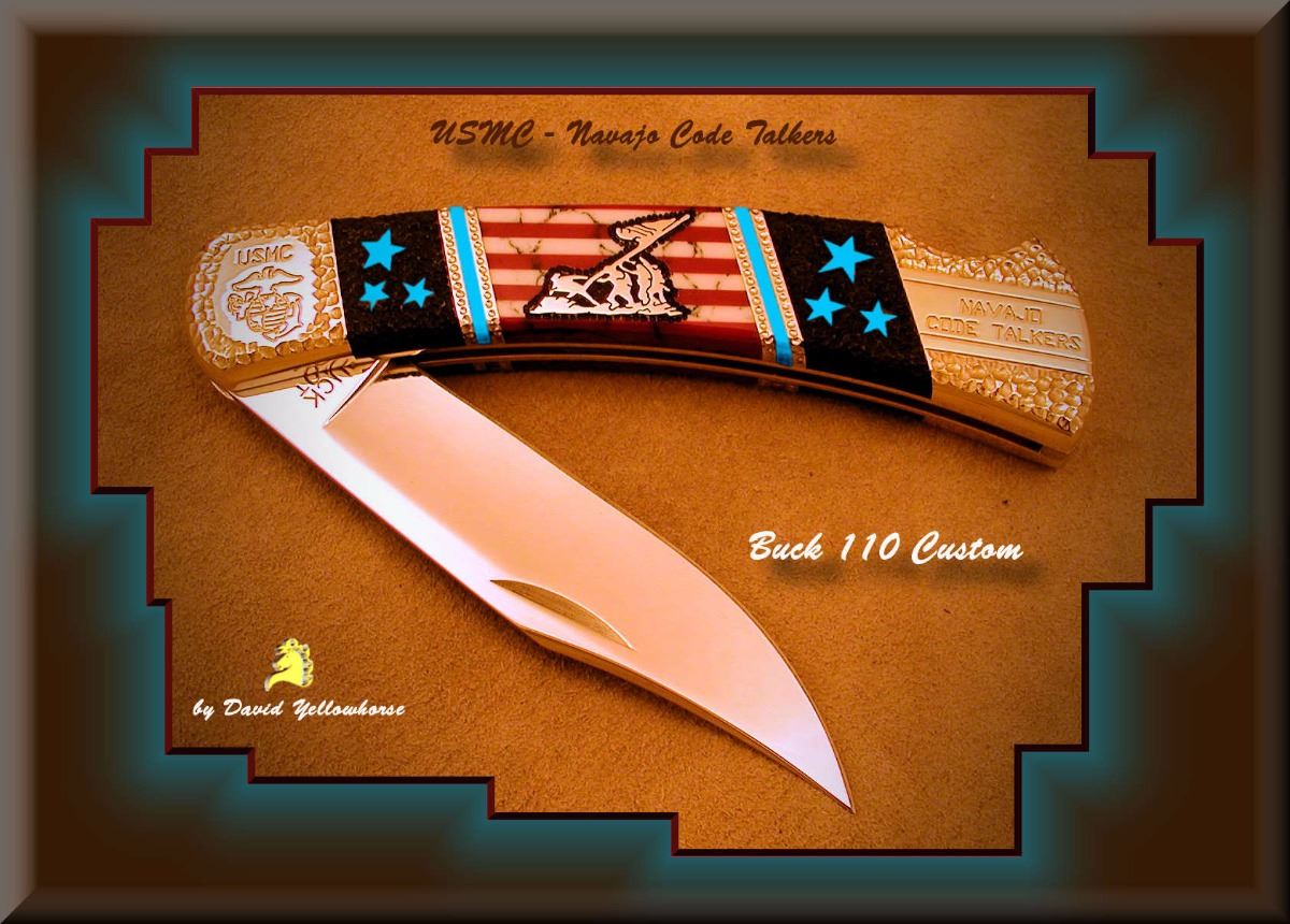 The USMC Navajo Code Talkers by Yellowhorse - Heritage Collectables and David Yellowhorse, proudly present this exclusive edition commemorating the raising the US flag at Iwo Jima. David starts with a Buck #110 featuring mirror polished blade, and transforms it into a very unique one-of-a-kind piece of Navajo artwork! He hand cuts the flag raising scene from Nickel silver and inlays it into Web Turquoise accented with Bloody Jasper strips. This scene is accented with textured silver strips, blue turquoise and black jet stone. The polished, black bolsters are textured and personalized, while the blade features our HC logo, serial # 1/1 and Artist’s signature. USMC Navajo Code Talkers by Yellowhorse comes featured in a walnut and glass presentation case complete with authenticity plaque.
