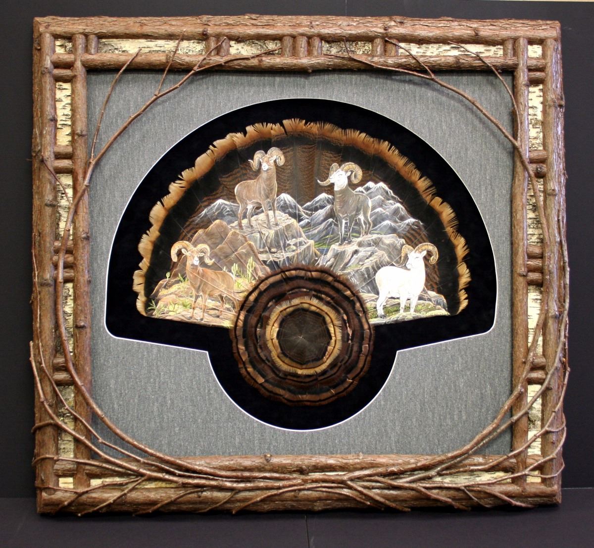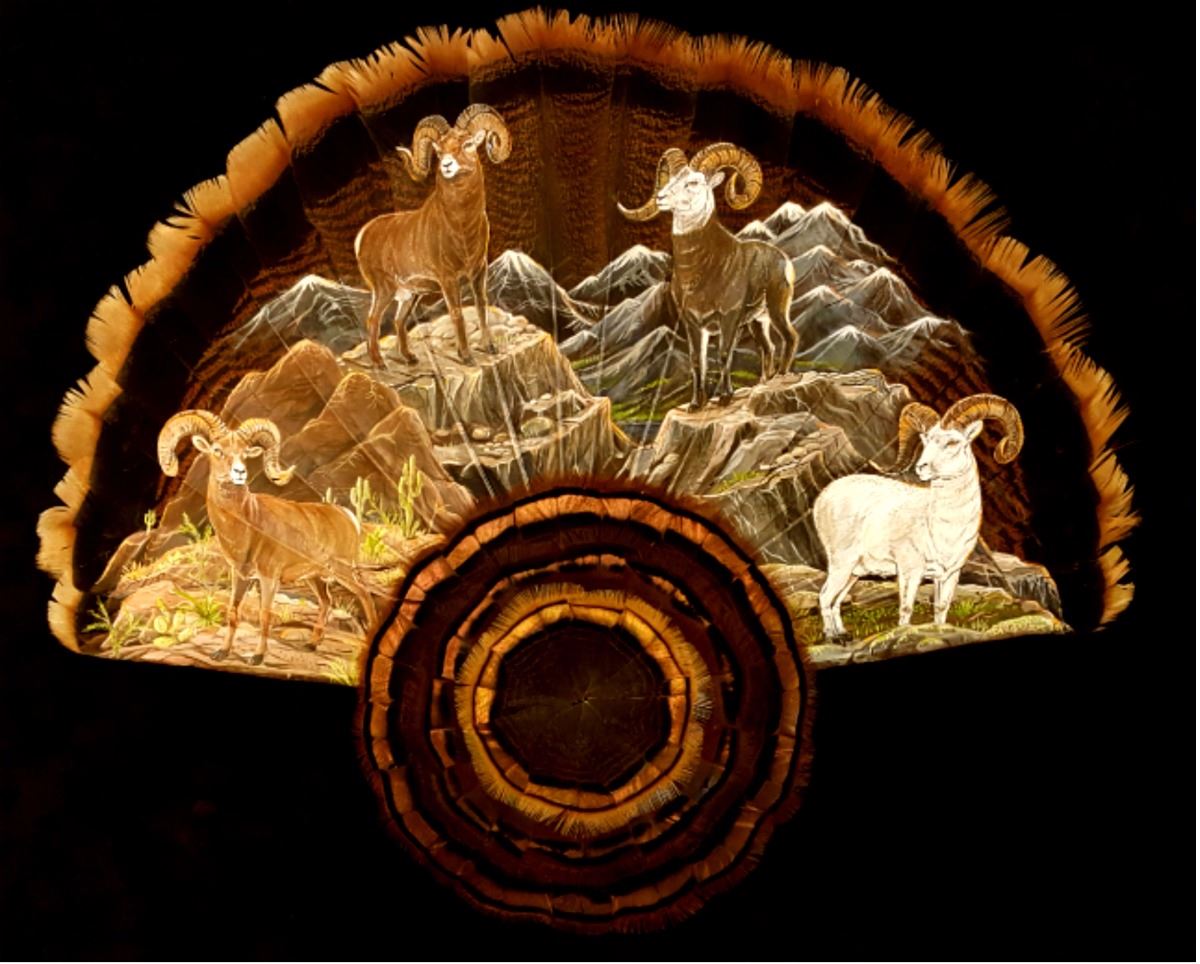 Donation: A stunning combination that blends elements of fine art, woodworking, and painstaking craftsmanship into one. “Fan of the Slam” is one of a kind “original” acrylic painting from wildlife artist Erich Carlson, depicting a beautiful representation of the “FNAWS” of Wild Sheep. Each “sheep” species is painstakingly hand painted on the full tail fan of an Eastern Wild Turkey, then carefully matted and mounted on the highest quality suede boards. This unique piece is complemented by one of Erich’s carefully hand crafted frames made of Northern White Cedar and Birch. The painting is then protected by a top museum grade UV proof non-glare glass.