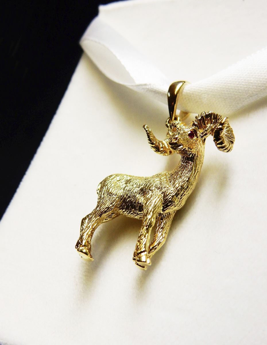 GOLD BIGHORN SHEEP “FULL BODY” PENDANT WITH RUBY EYES & 14K GOLD BIGHORN SHEEP “FULL CURL” EARRINGS