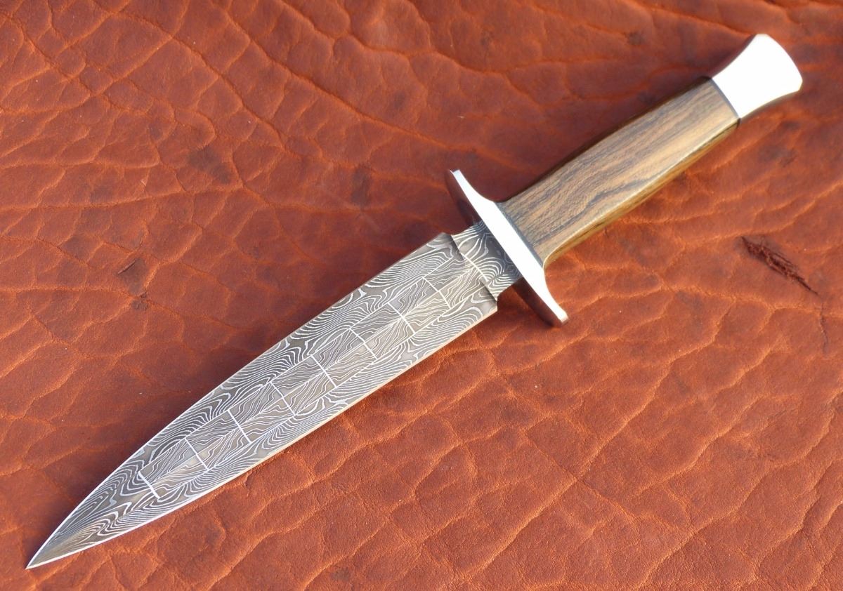 Donation: The dagger features a 6 3/4” blade of mosaic pattern welded Damascus with a center section containing shrapnel from a 155mm howitzer. The blanks are being forged by Pennsylvania artist, Robert Eggerling and then forwarded to Cody, Wyoming artisan-custom knife maker, Dennis Friedly then engraved by Bruce Shaw. The blade is shaped and grounded by hand as are the handle components. The stainless pommel will carry the Wounded Warrior Outdoors logo and finished with exotic Ziracote hard wood. The overall length of the piece is 11 1/2”.