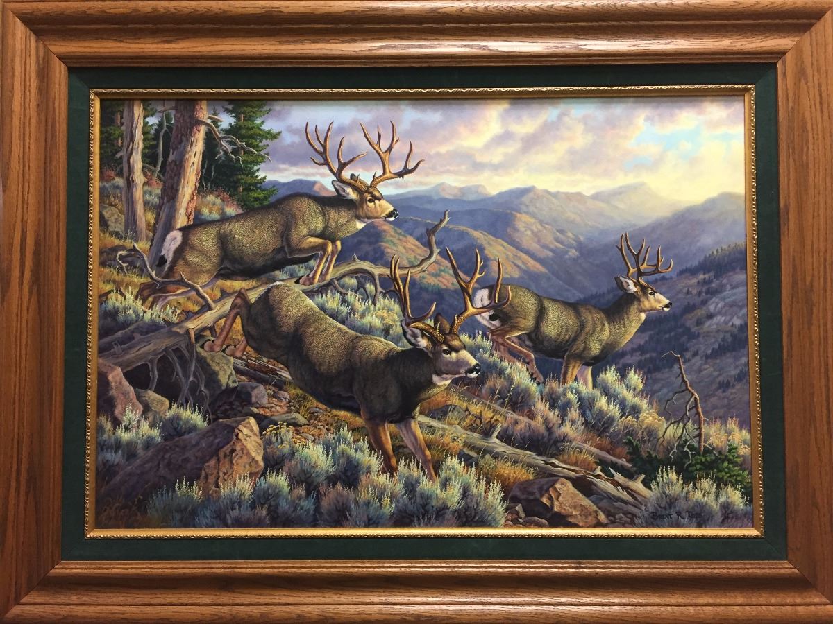 In a split second you have to decide to shoot or not to shoot. In a flash the big bucks will disappear over the ridge and out of sight. That memory will be there forever of the time you jumped those big bucks and they busted out, giving you a chance before vanishing from site. This original 24x36 painting by Brent R. Todd is a one-of-a-kind. A certificate of authenticity will be provided by the artist.