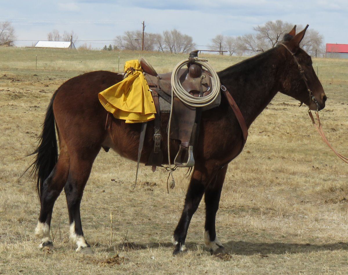 Copper” is a beautiful 6-year old bay horse mule. He is an excellent trail mule and has led lots of pack strings on him. Very gentle and easy to catch and is easy about his feet. He doesn’t give you any trouble crossing water and has seen hundreds of trail miles. I have been doctoring calves on him all spring. He tracks a calf and handles the rope well. He is hobble broke and loads in a trailer with ease. He’s easy to clip and good around dogs and has packed everything we need on the mountains from elk to hard panniers. He’s a great mule that should work for most everyone.