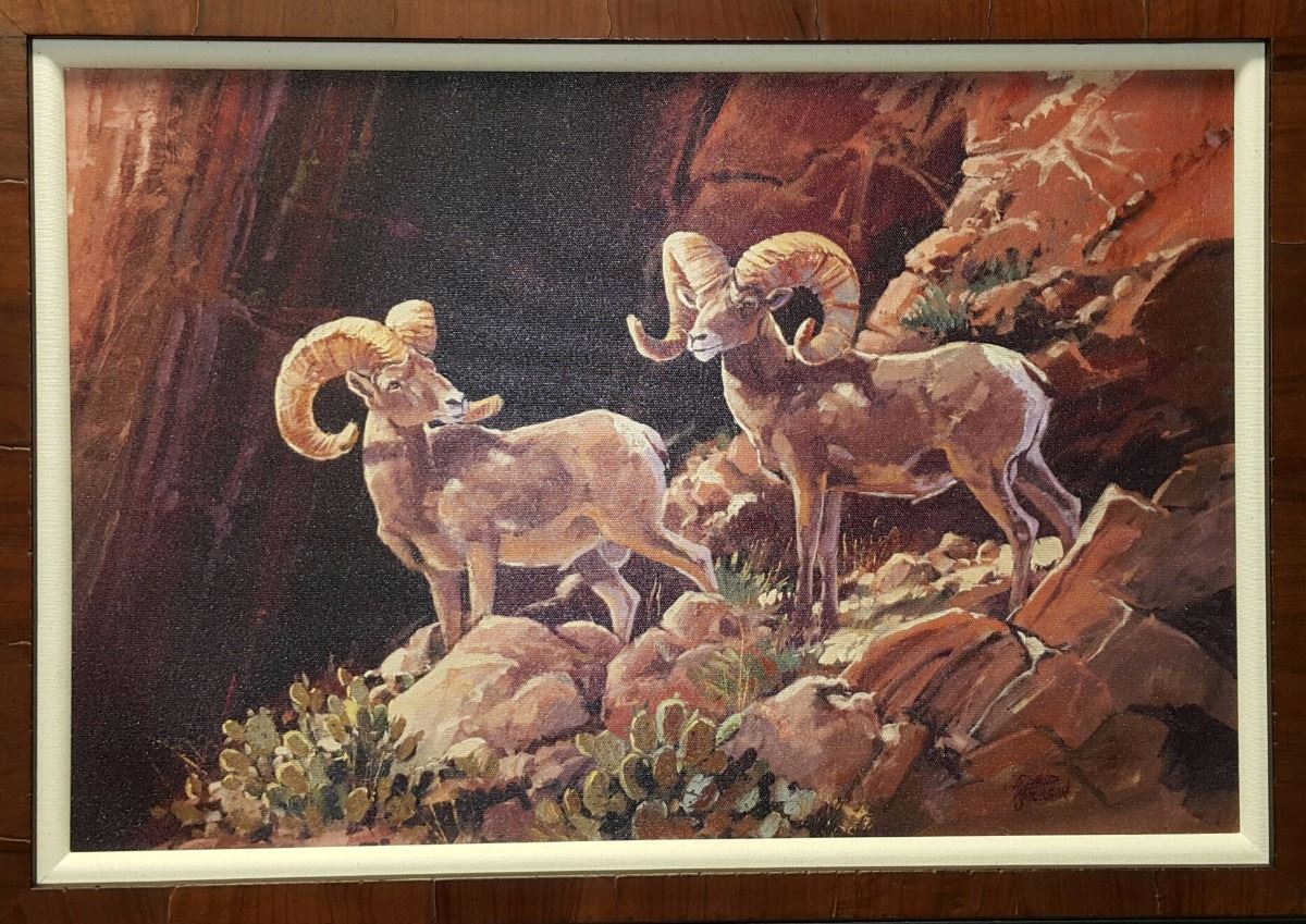Artist David Jackson is always striving for excellence. He loves new challenges and opportunities which provide him with creative resources. He receives inspiration from the beautiful surroundings of his home and studio in Mountain Green, Utah. This piece titled “Sons of the Desert” depicts two magnificent Desert Bighorn Rams on a mountain ledge. In real life the image would be any sheep hunters dream come true. This is the perfect piece of art over the fire place mantel. David Jackson is a strong supporter of numerous wildlife and charitable organizations including the ECWSF and we thank him for this full donation.