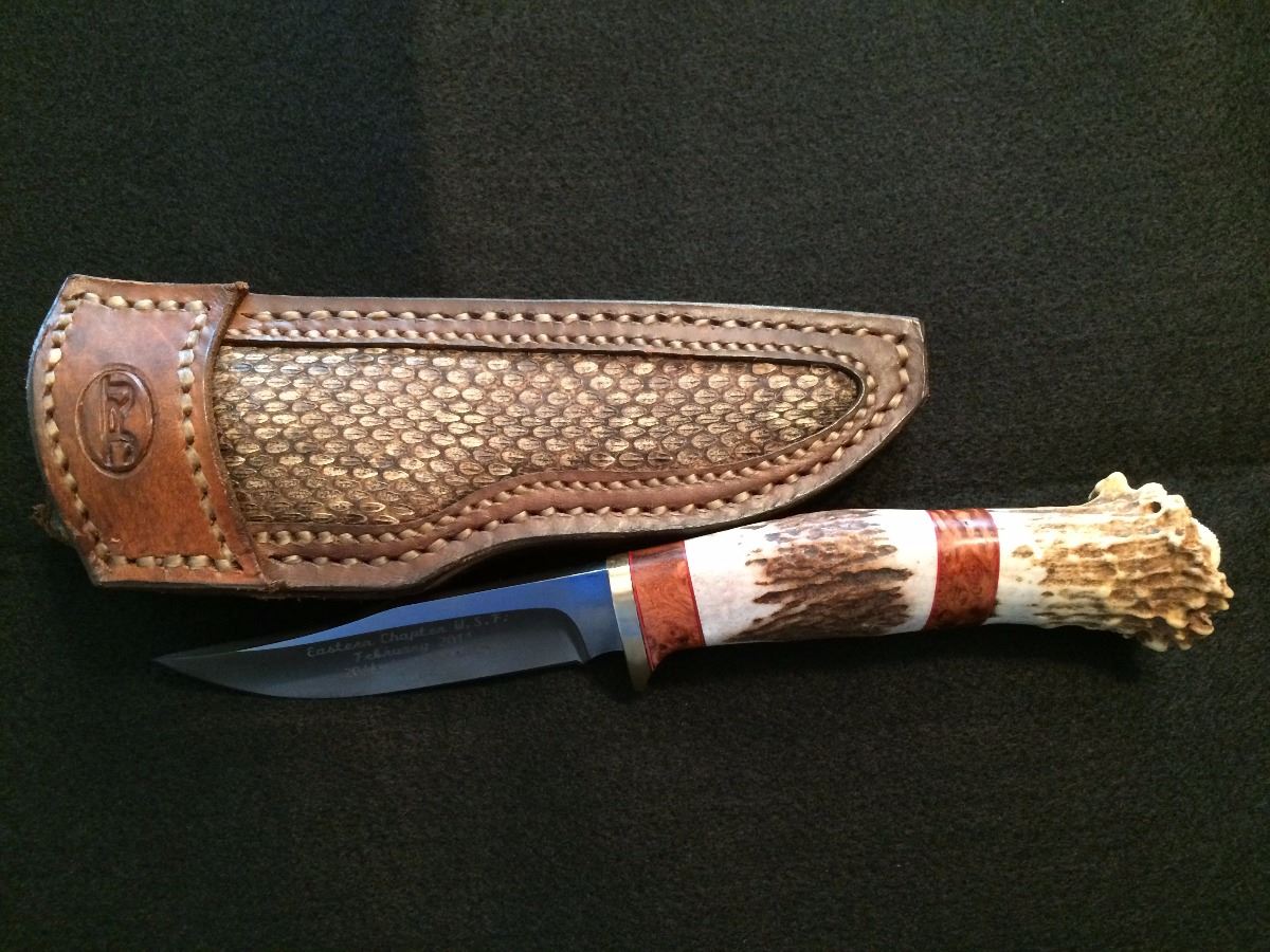 This custom knife was built by John R. Johnson of JRJ Knives in New Buffalo, PA. Only the finest materials available go into a JRJ custom knife. The expert craftsmanship, attention to detail and intricate handwork are what separates their knives from other knife makers. RJR knives are built one at a time to be strong, functional and so each knife has it's own personality and distinct look. This one-of-a-kind custom example of the knife maker’s art is 9” overall with a 4” blade engraved “Eastern Chapter W.S.F. February 2011 20th Anniversary 1 of 1”. The handle is constructed of deer antler and curly maple with a solid brass hand guard. The custom leather sheath includes a snakeskin accent panel.