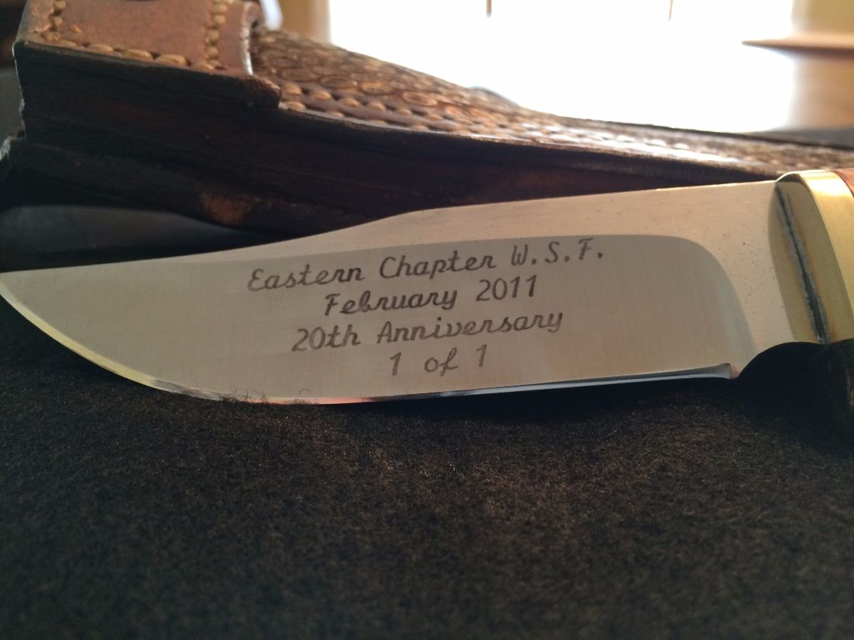 This custom knife was auctioned at our 20th Anniversary Banquet in 2011. The proceeds were donated to Camp Compass. Eastern Chapter Life Member Dallas Strait was the high bidder at $10,000 and donated it back to the Chapter to auction again! Glen Pyne, another ECWSF Life Member, was the second round high bidder at $7,000! That’s right, this knife provided a total of $17,000 in funding for Camp Compass in 2011.