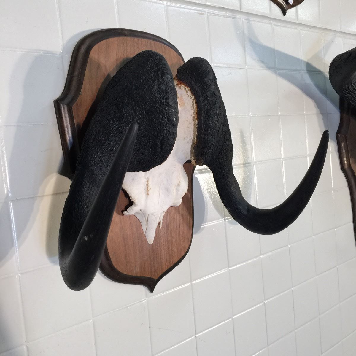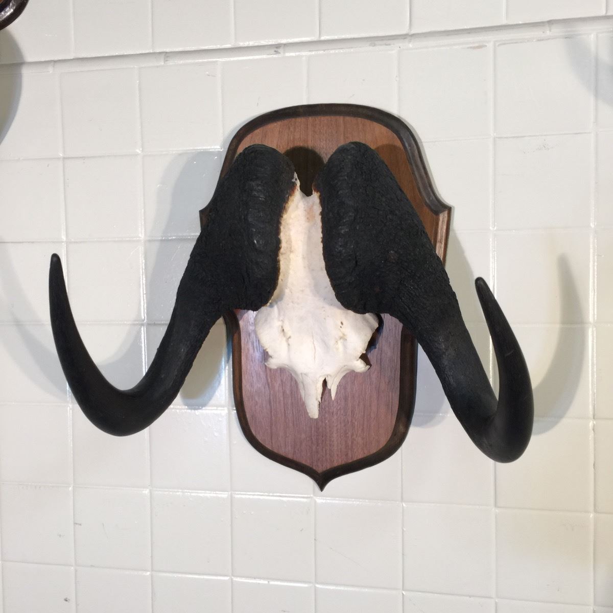 BLACK WILDEBEEST SKULL AND HORN SET, 16'' WIDE, 18'' DEEP