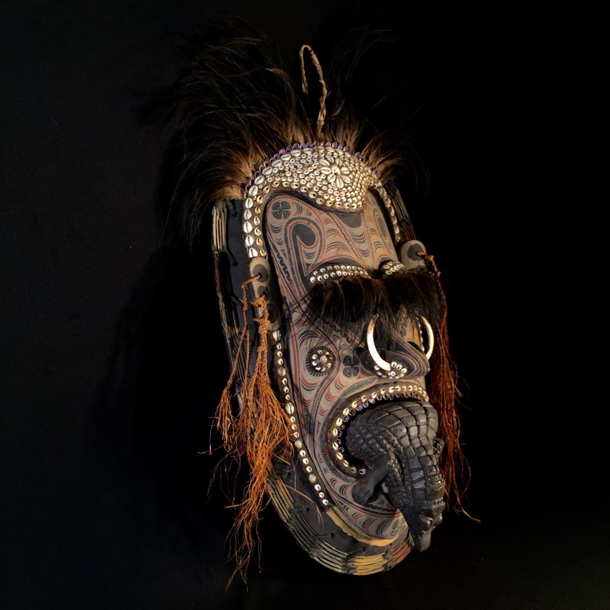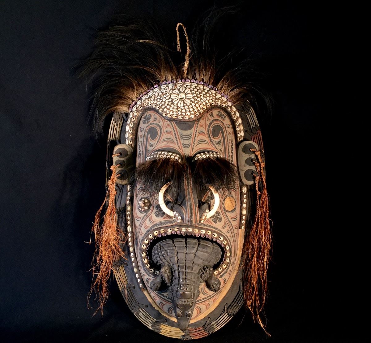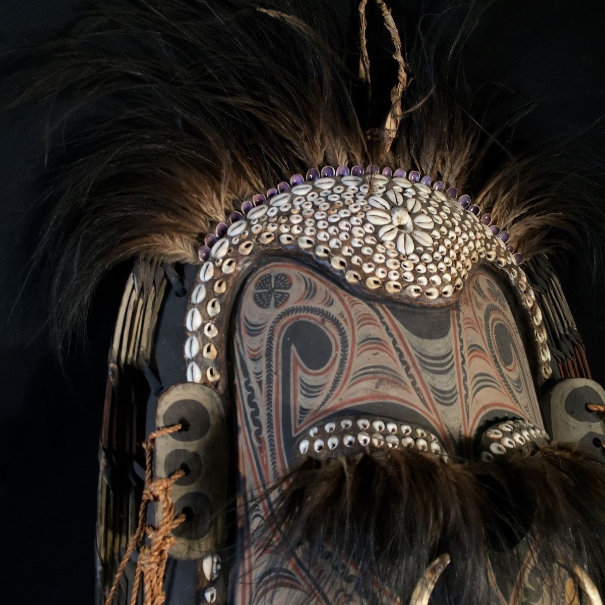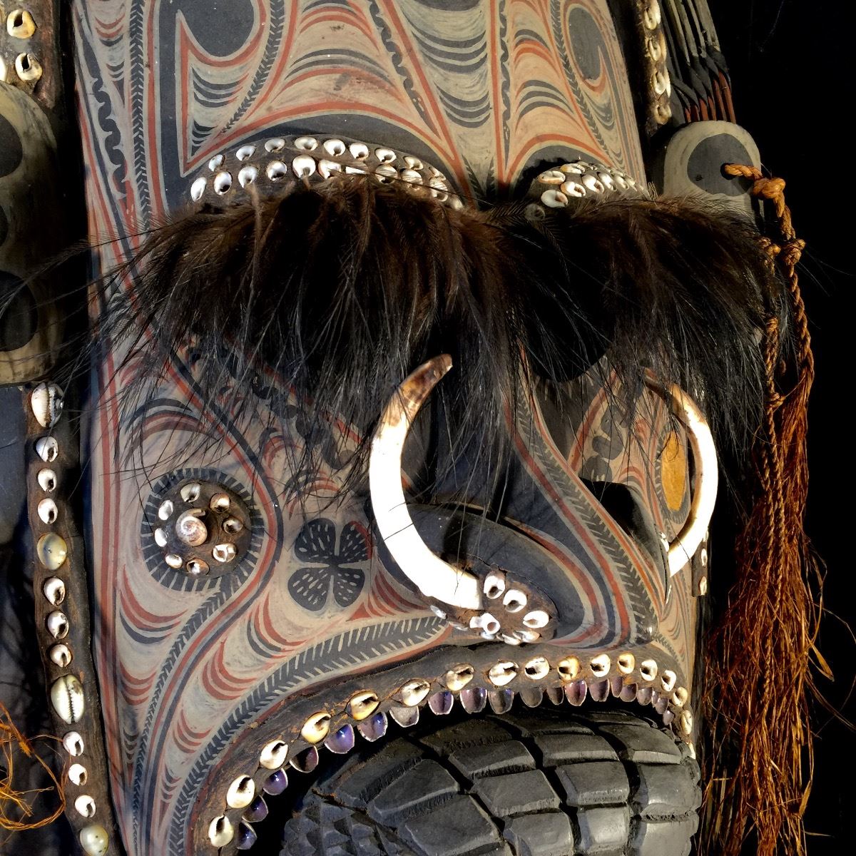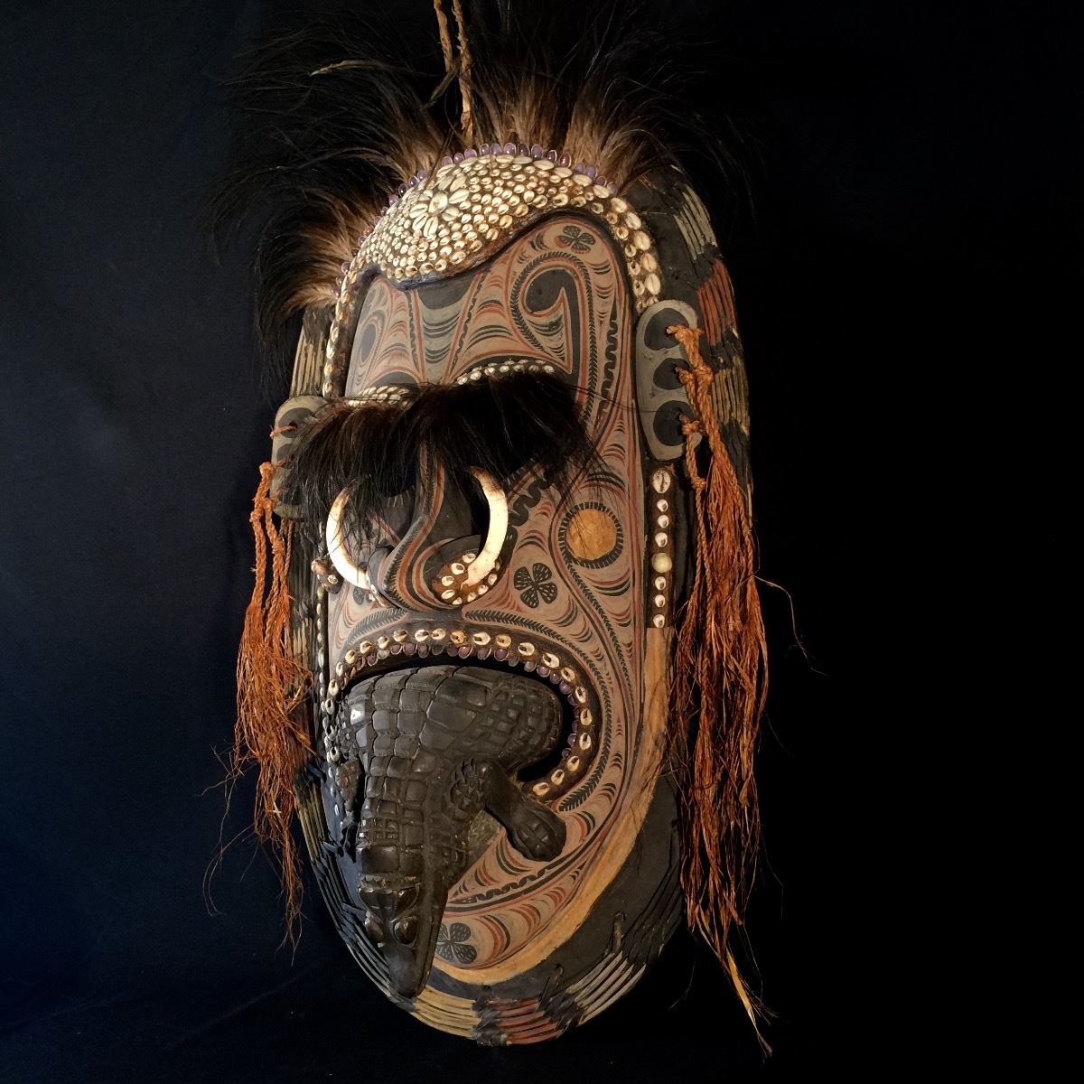 NEW GUINEA, EXCEPTIONALLY CRAFTED CEREMONIAL MASK FEATURING WARTHOG TUSKS, CONCH SHELLS, AND OSTRICH PLUMES, 3' H