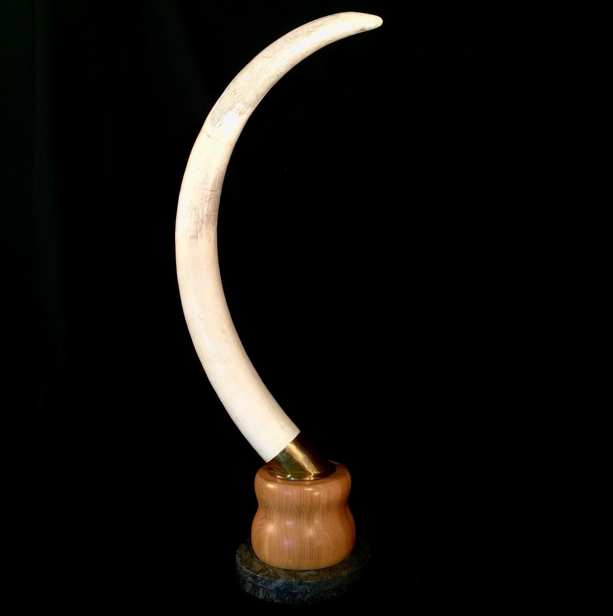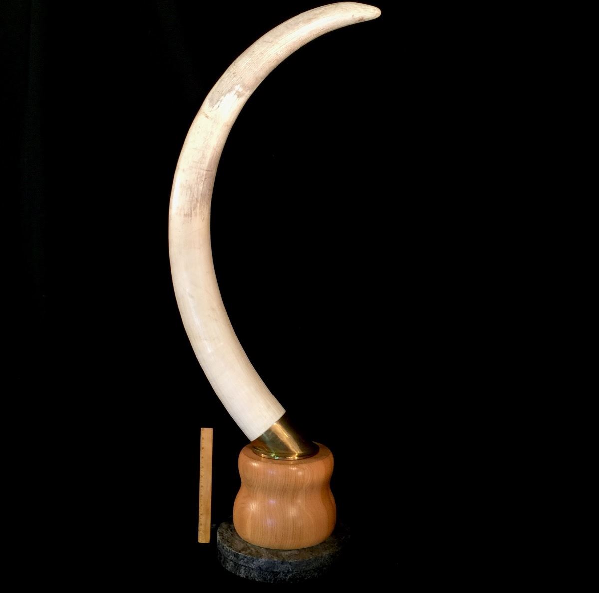 ELEPHANT IVORY TUSK ON CUSTOM GRANITE/OAK BASE, TUSK LENGTH APPROX. 60" LONG **NOT EXPORTABLE**