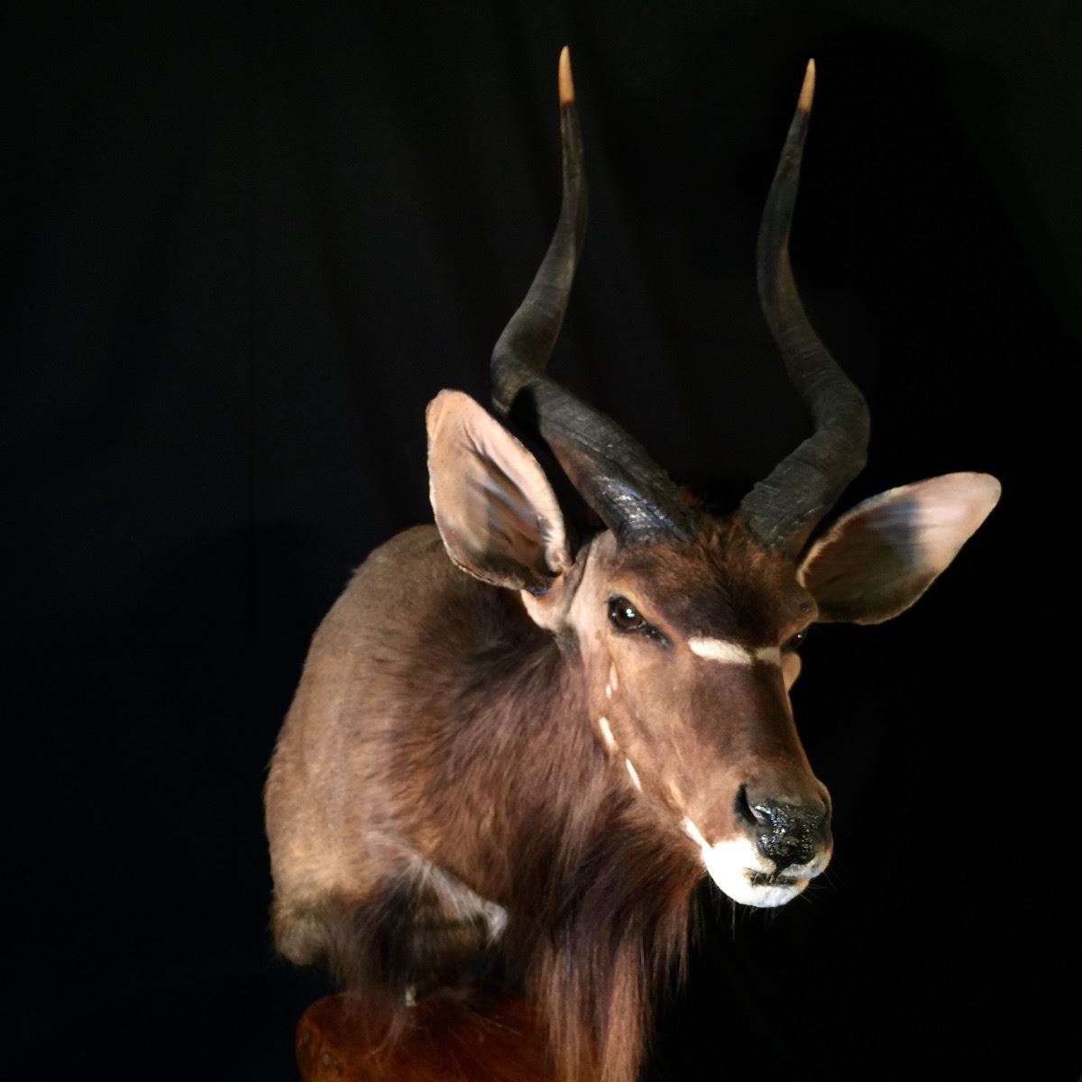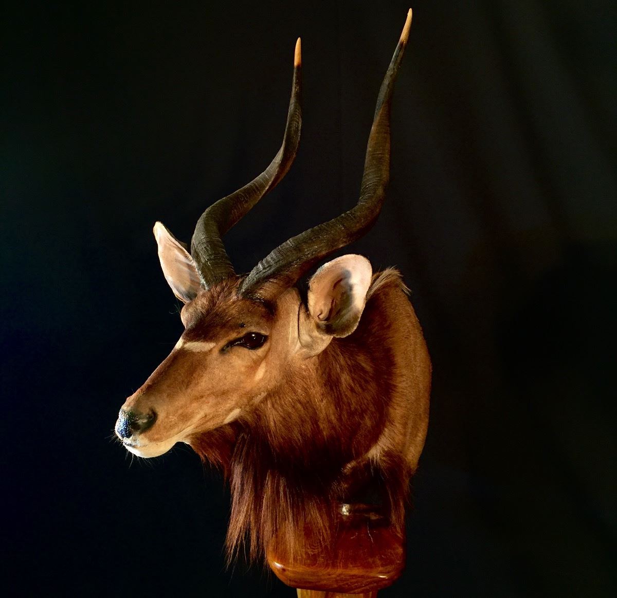 Lot 60 AFRICAN NYALA (TRAGELAPHUS ANGASII) HEAD MOUNT ON WOODEN STAND, 6' TALL