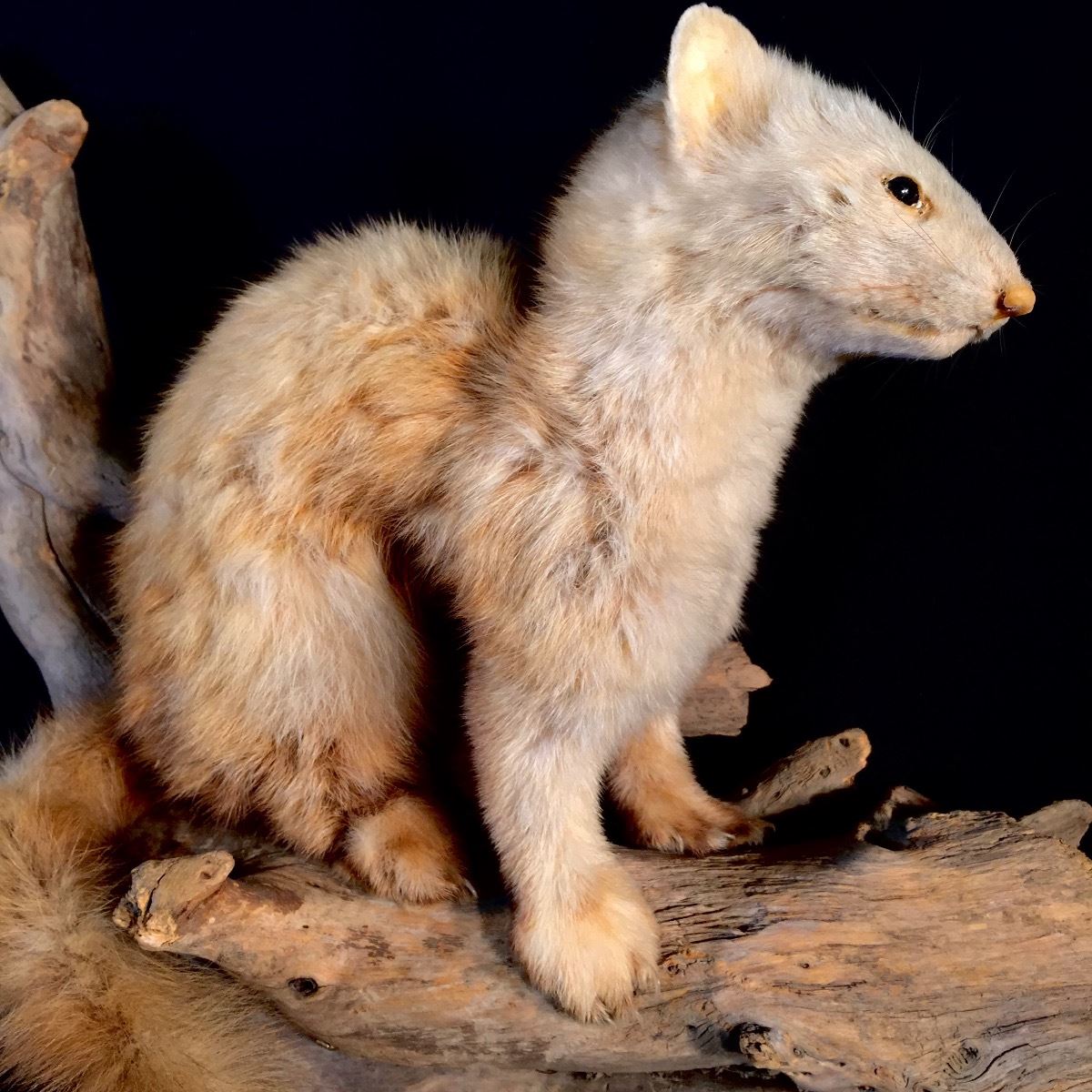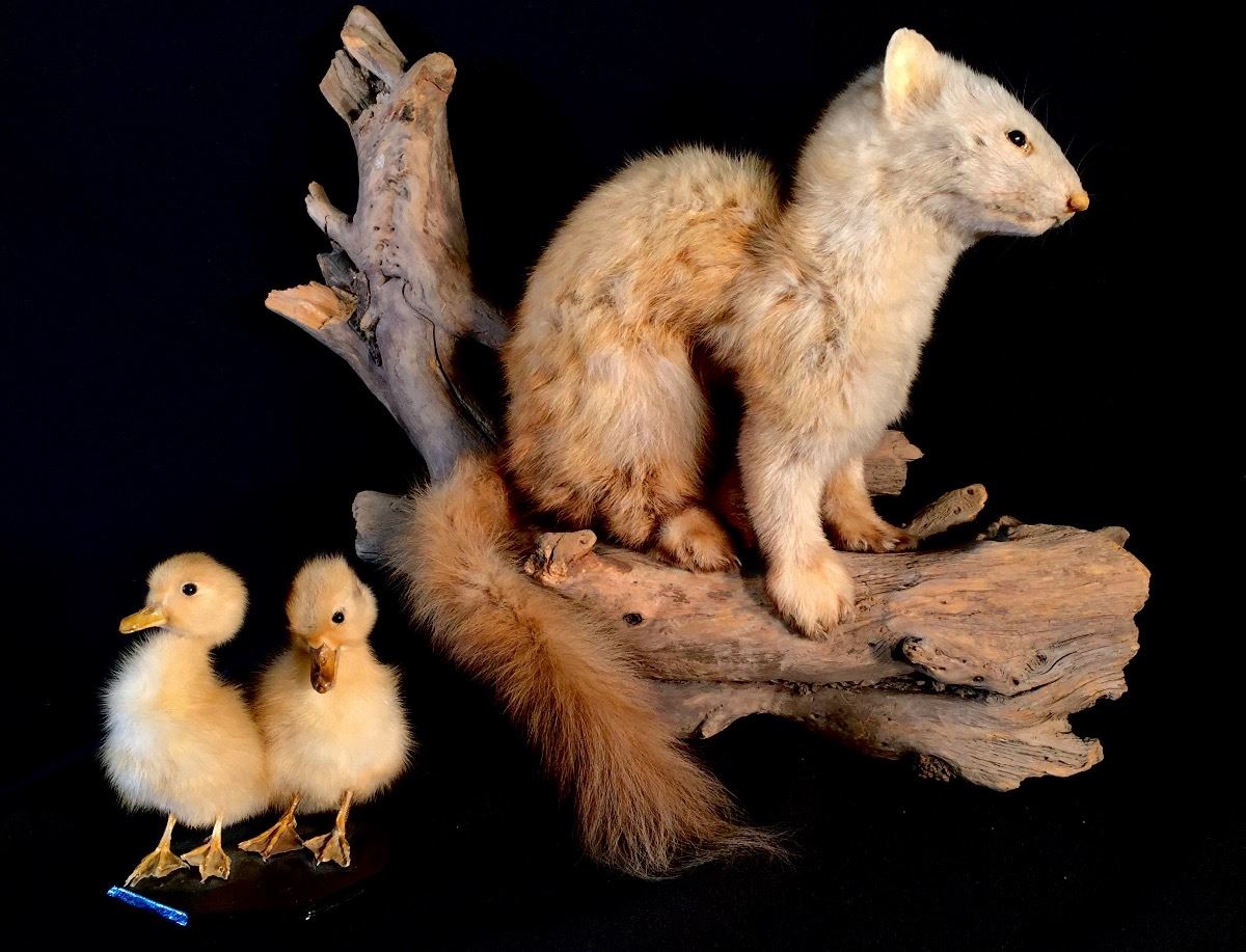 Lot 75 MARTEN WINTER PHASE FULL BODY MOUNT ON WOOD DISPLAY WITH PAIR OF MALLARD DUCKLINGS
