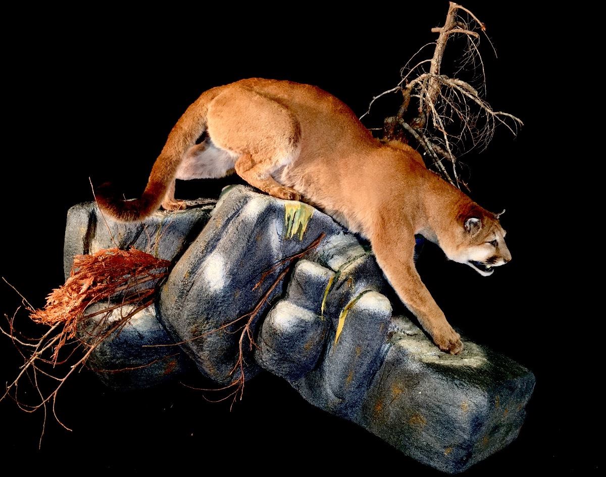 SPECTACULAR MOUNTAIN LION (PUMA CONCOLOR) FULL BODY MOUNT, 55'' LONG, 50'' HIGH FROM BASE COUGAR STANDING ON WALL MOUNT ROCKY RIDGE