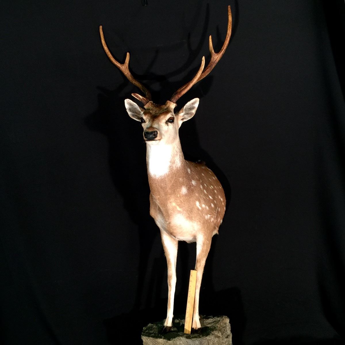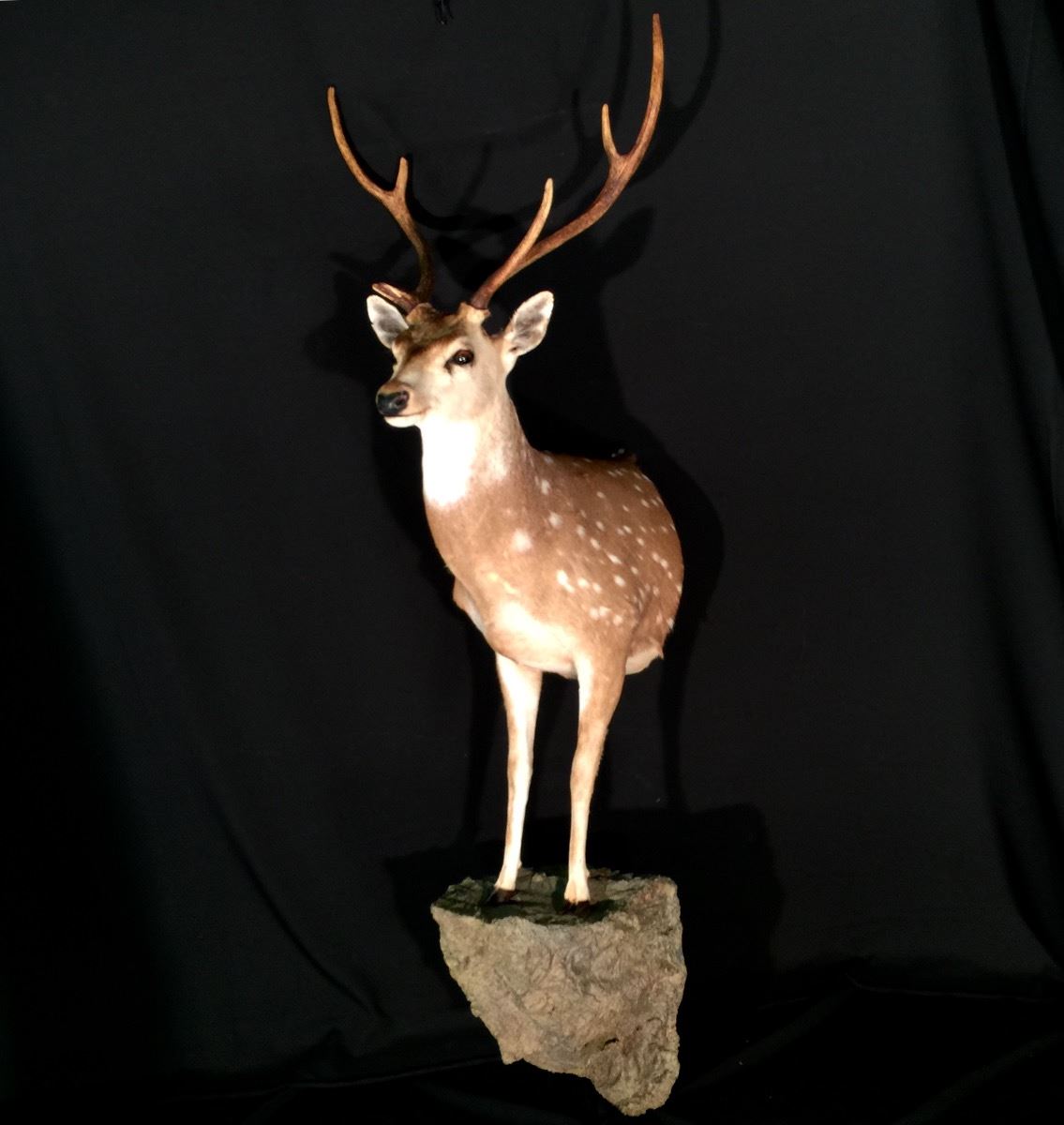 INDIAN AXIS DEER (AXIS AXIS) HEAD AND FRONT QUARTERS MOUNT ON ROCK, 5' H, 28'' DEEP