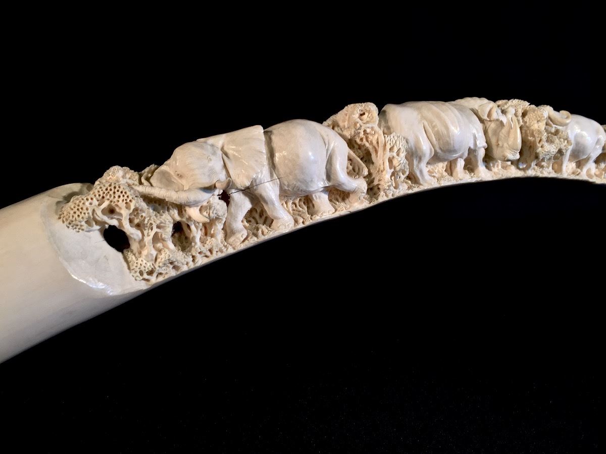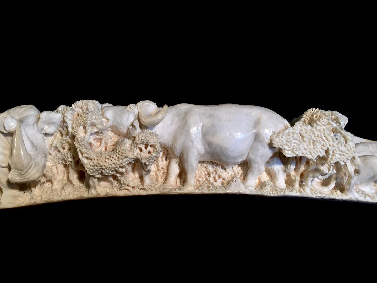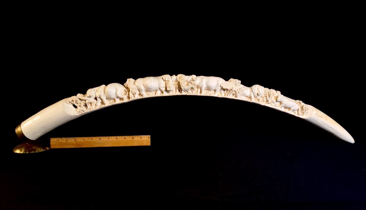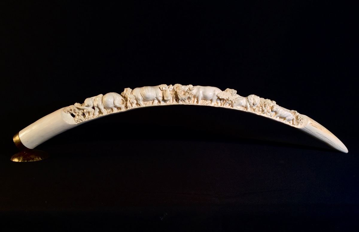 Lot 101 INTRICATELY HAND CARVED IVORY TUSK DEPICTING THE "BIG 5" OF AFRICAN GAME TROPHIES: **NOT EXPORTABLE*