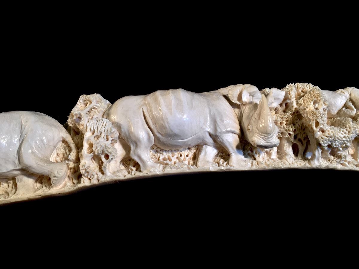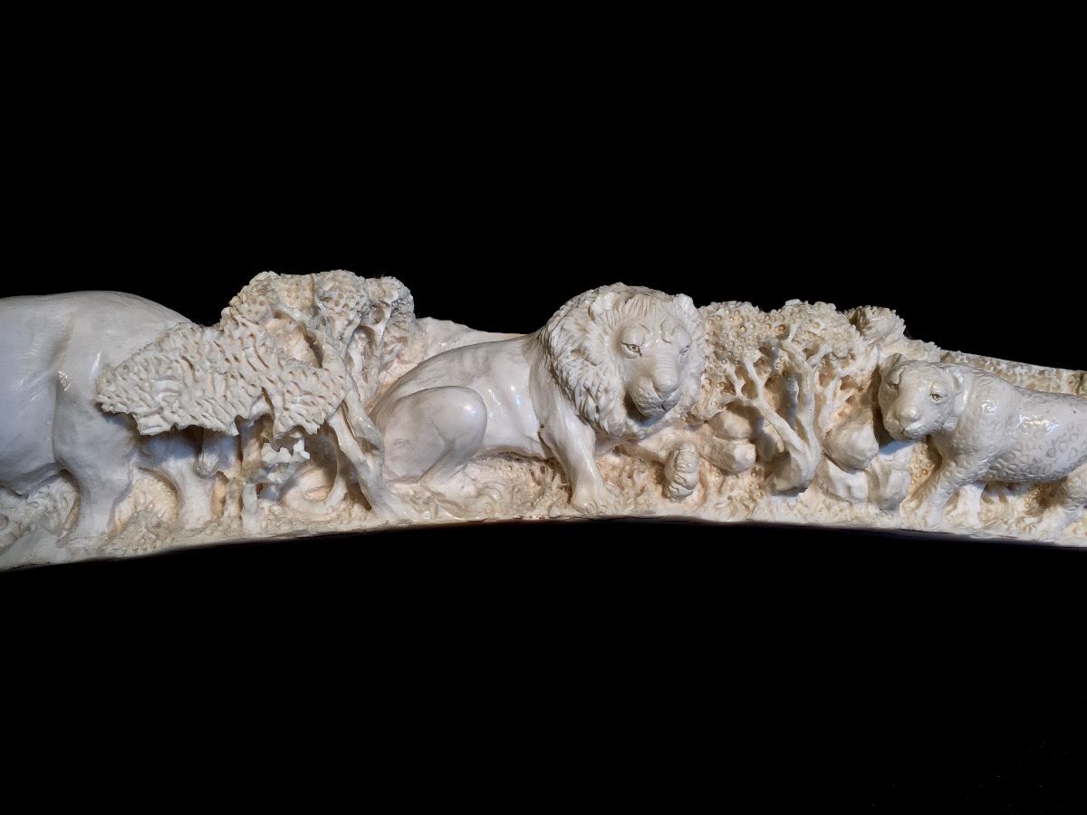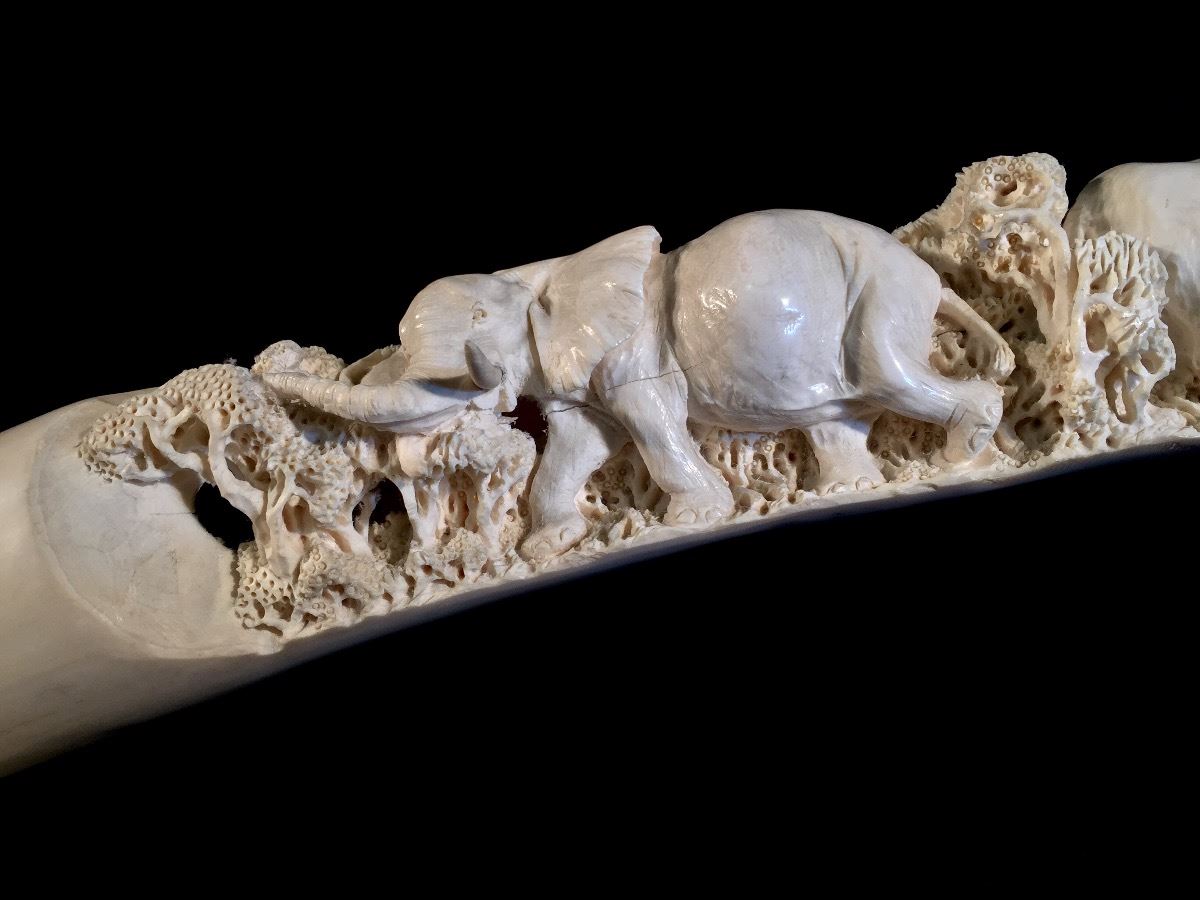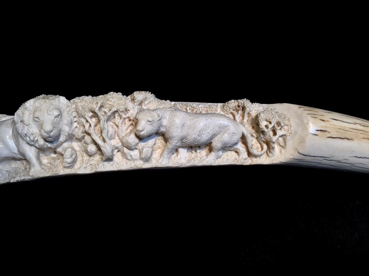 Lot 101 INTRICATELY HAND CARVED IVORY TUSK DEPICTING THE "BIG 5" OF AFRICAN GAME TROPHIES: **NOT EXPORTABLE*