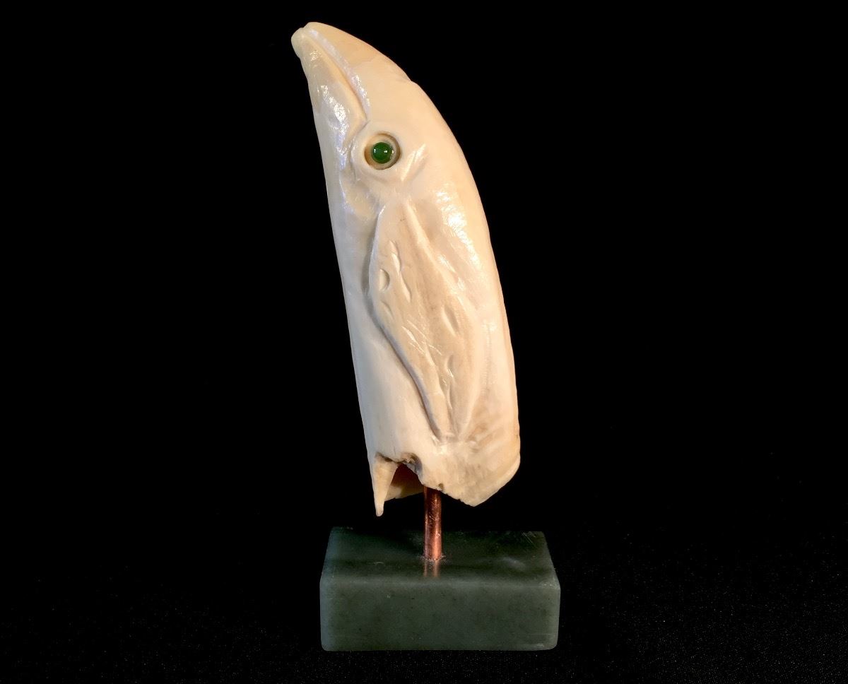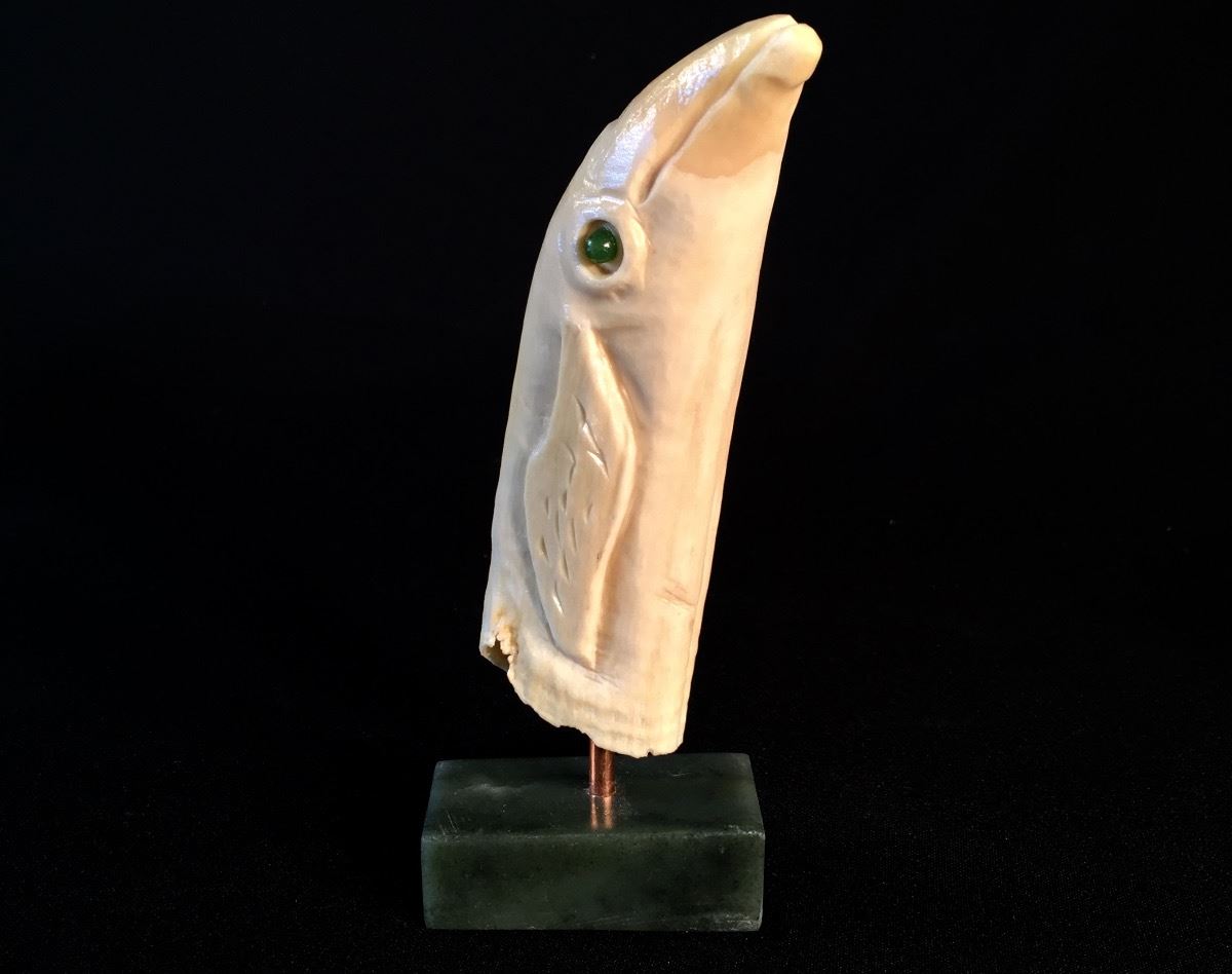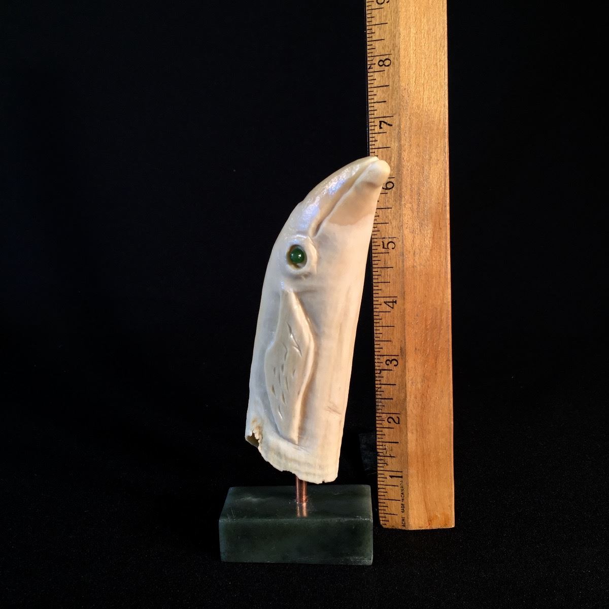 CARVED KILLER WHALE TOOTH DEPICTING A WHALE WITH JADE INSET EYES, ON STAND, 7'' H
