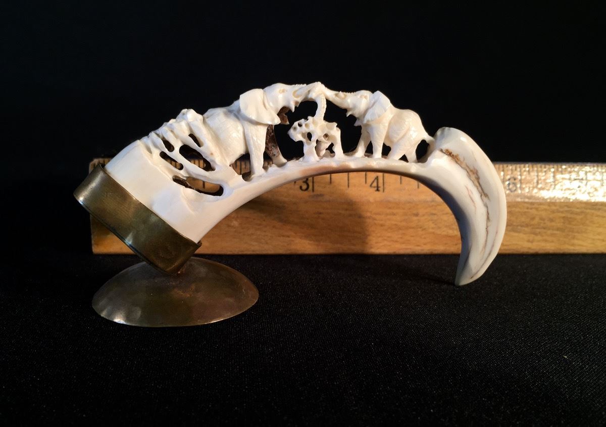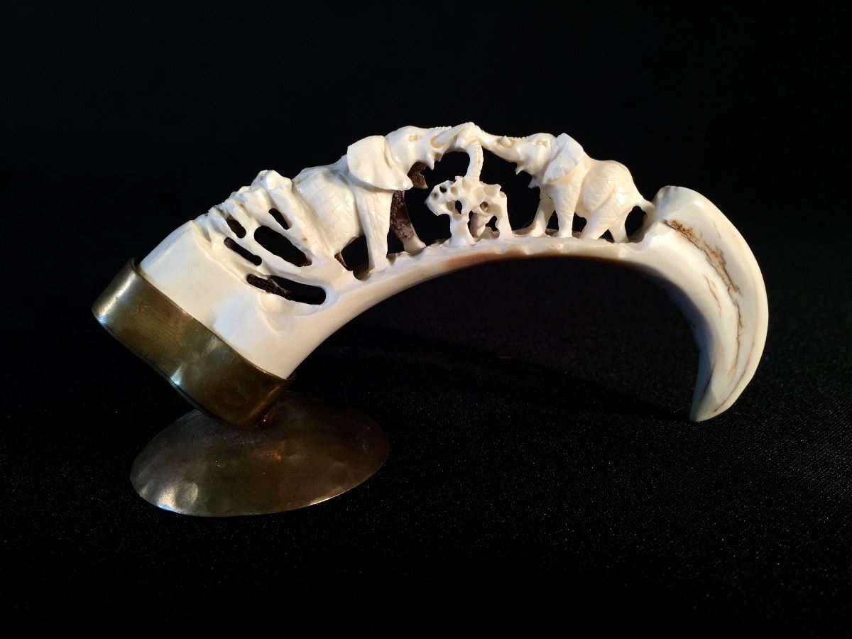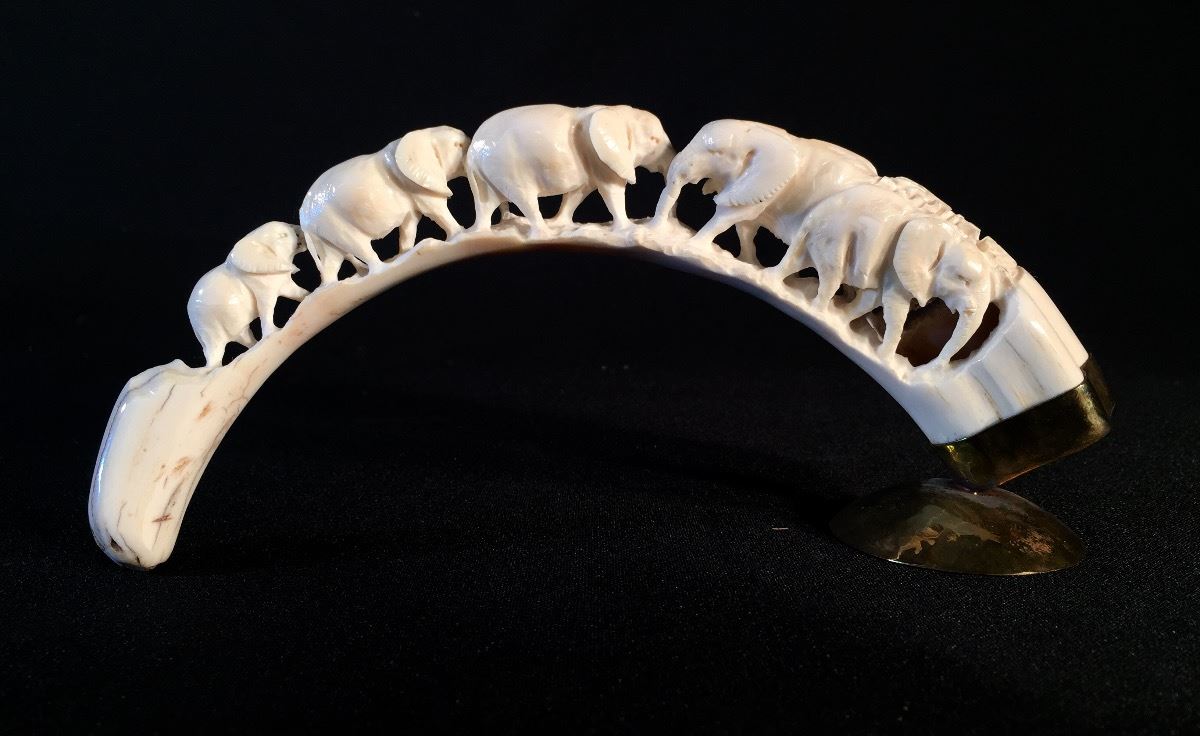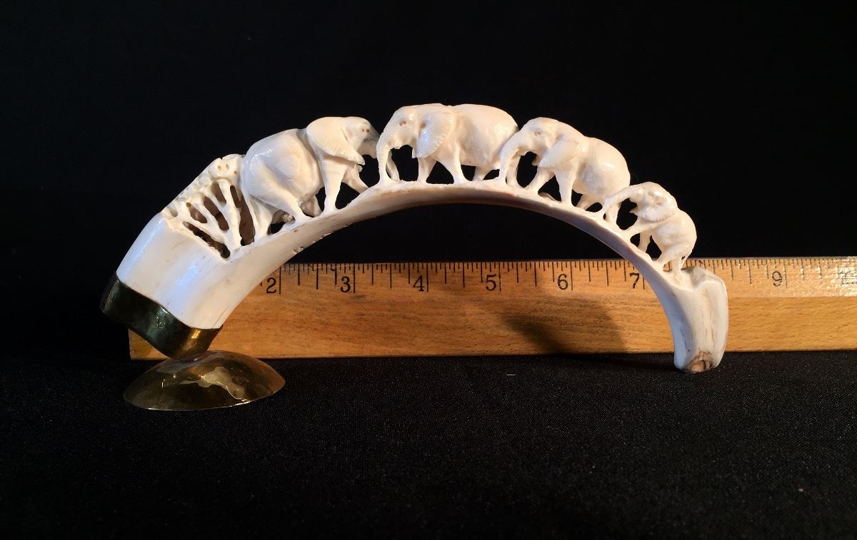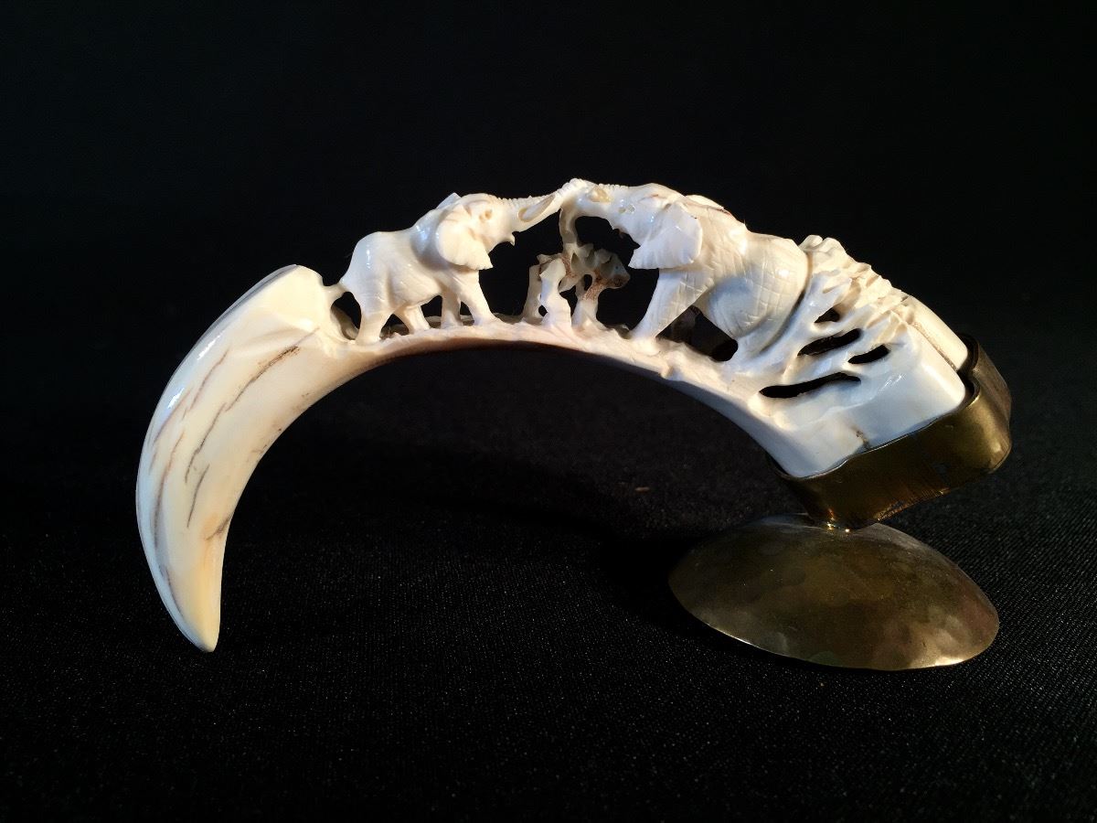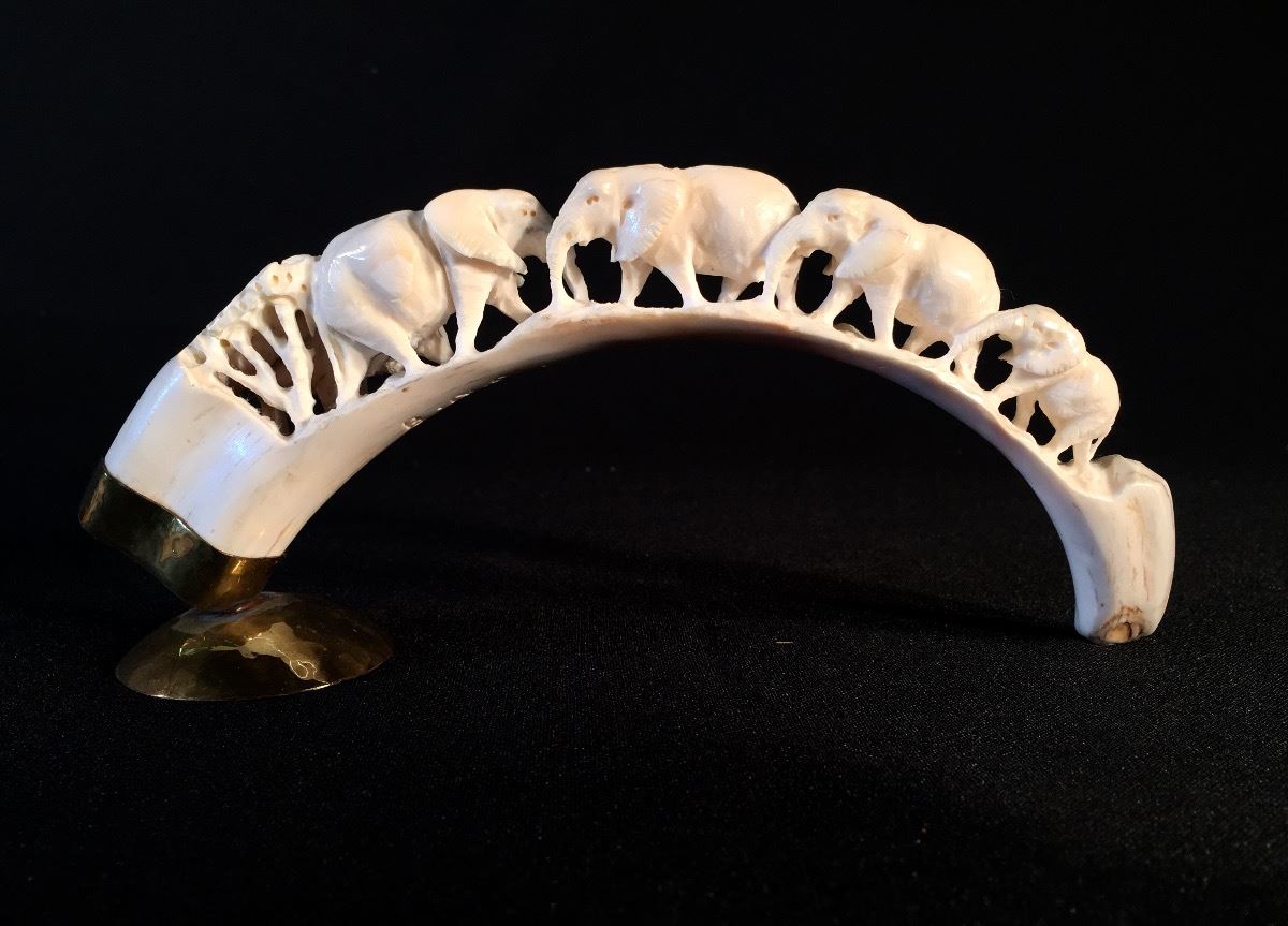Lot 114 2 CARVED TUSKS DEPICTING ELEPHANTS AND ELEPHANT HERD, 5.5'' AND 10'' LONG **NOT EXPORTABLE**