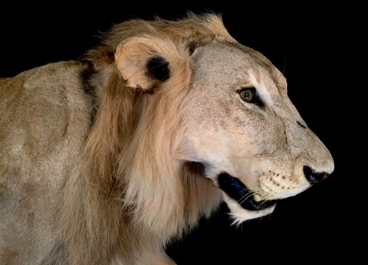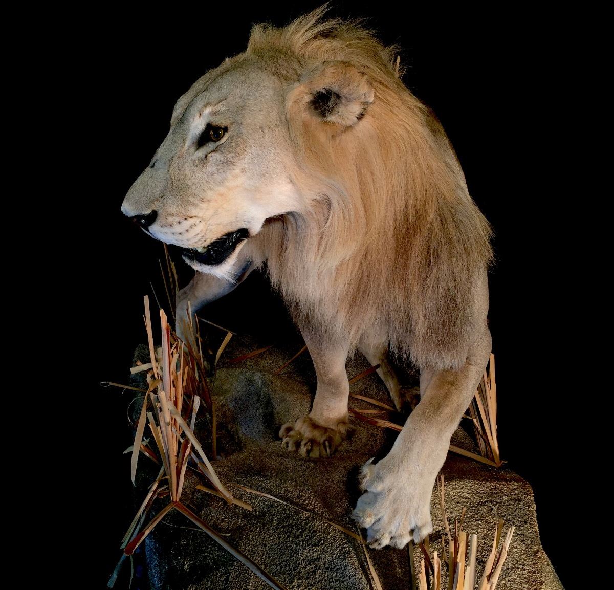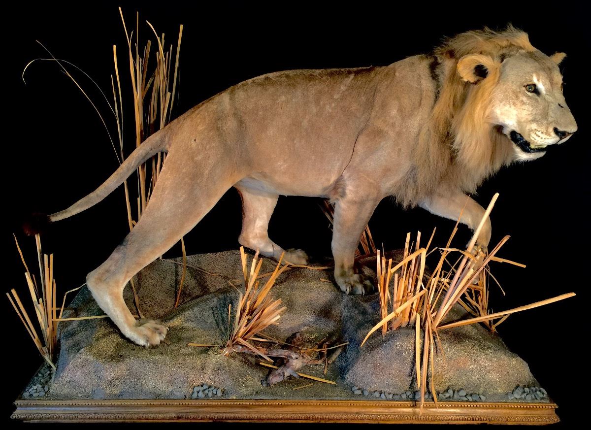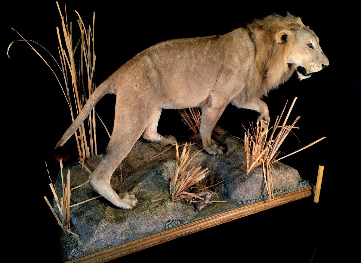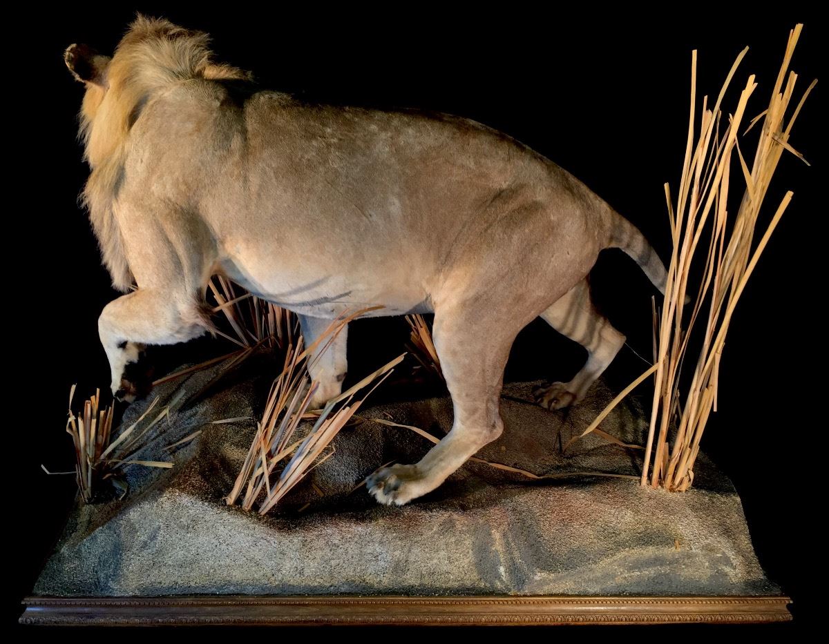 Lot 117 AFRICAN PLAINS MALE LION (PANTHERA LEO) FULL BODY MOUNT ON STAND, 6' LONG, 39'' H