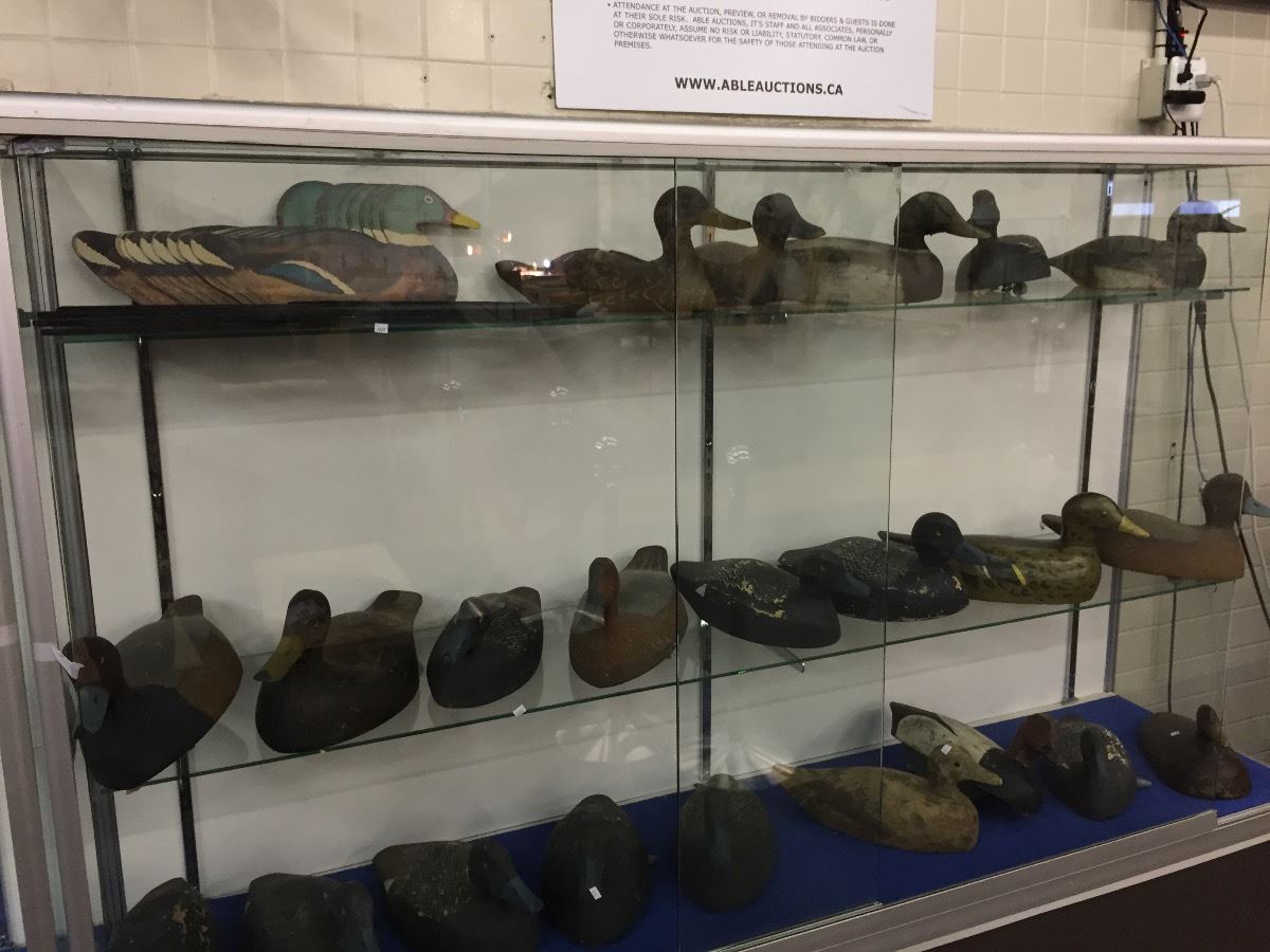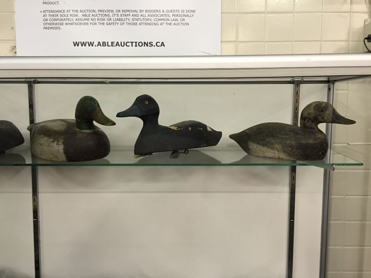 Lot 168 SHELF LOT OF 5 LIFE SIZE WOODEN DECOYS, AND APPROX. 12 WAXED CARDBOARD SILHOUETTE DECOYS