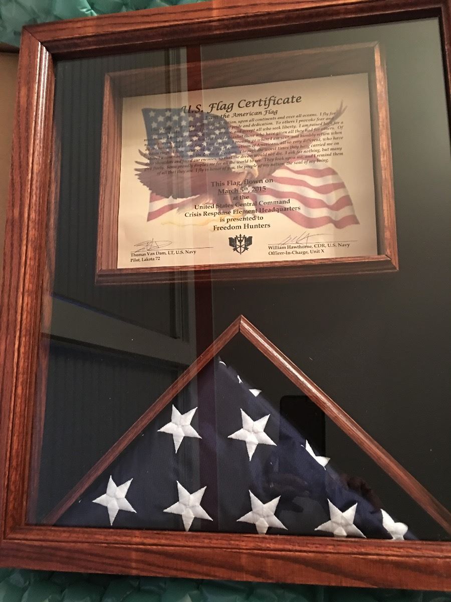 Bud DePlatchett with Freedom Hunters has donated this AWESOME US Flag carried by a USN Helicopter pilot while inserting US Special Forces on missions against the enemies of our country in the Middle East. This Flag will be housed in a US Made Hardwood Display Case and the certificate reads that is was flown March 5, 2015 at US Central Command Crisis Response HQ and is signed by the pilot that carried the flag and the Officer-In-Charge, Unit X. We truly appreciate this donation to our chapter and the proceeds of this item will go to help our veterans rehabilitate through the great outdoors!!!