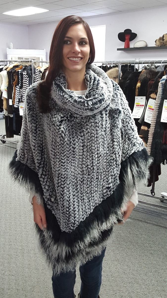 Lot 34 CLASSIC GREY/BLACK KNITTED REX RABBIT PONCHO W/LAMB TRIM