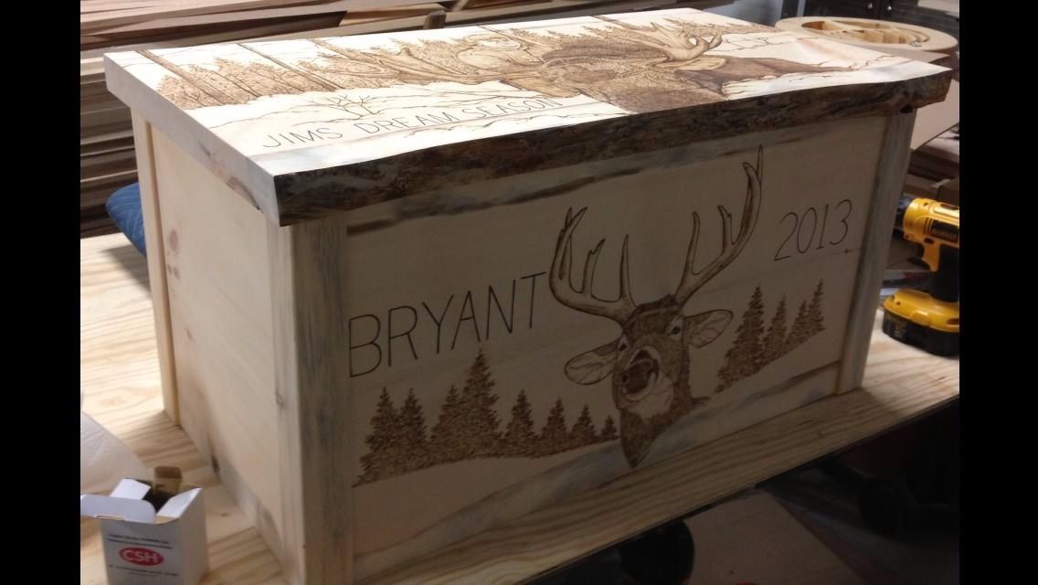 Lot 54 One Hard Wood Burned Box Custom Burned to Bidders Request, Two Animals & Two People
