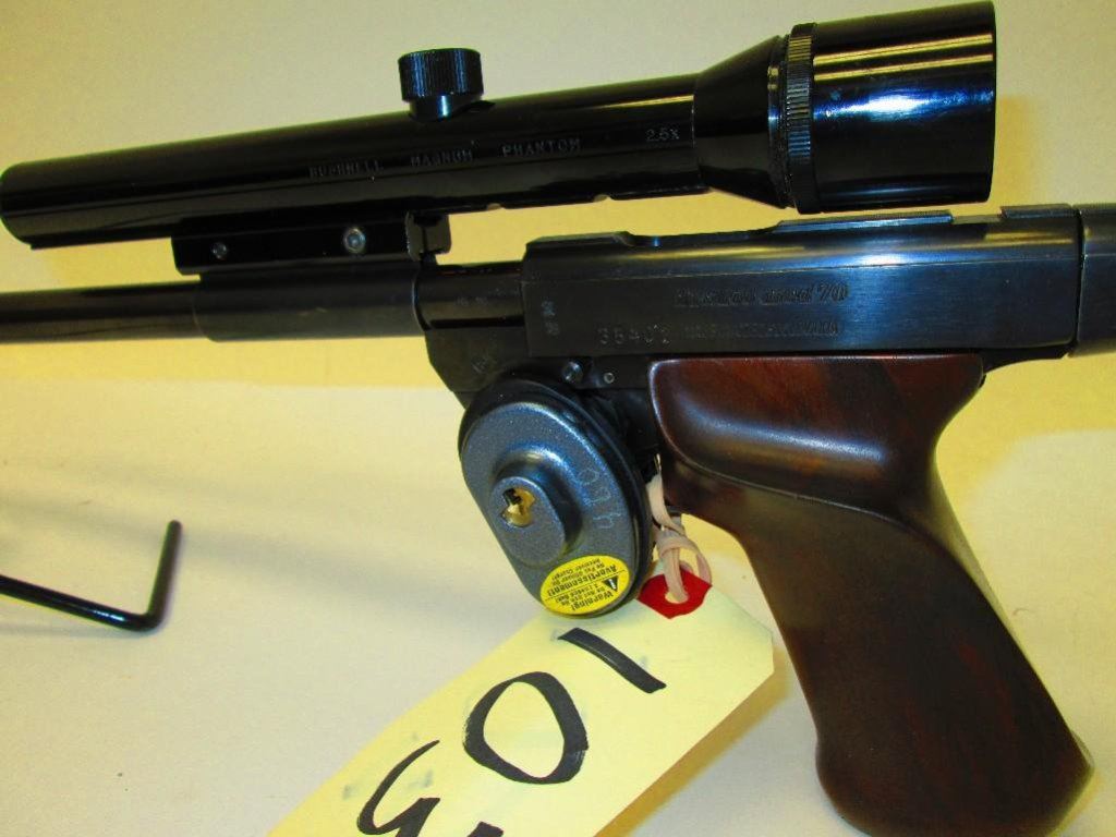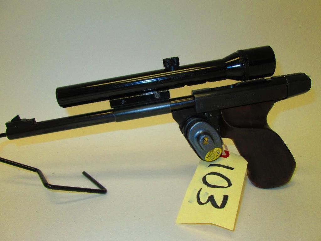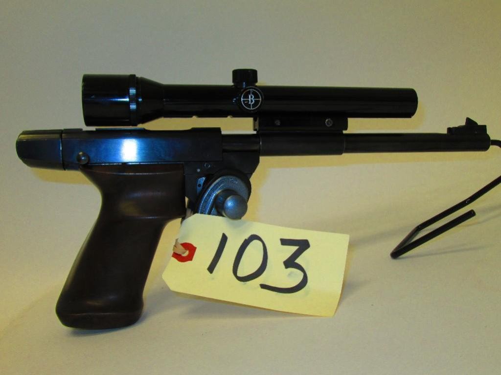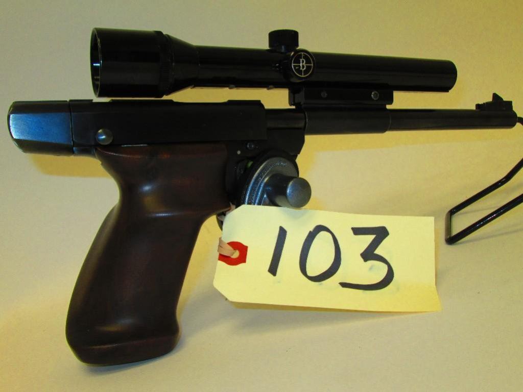 Lot 103 Single shot target pistol RESTRICTED With 1 piece walnut custom grips and 2.5 Bushnell scope