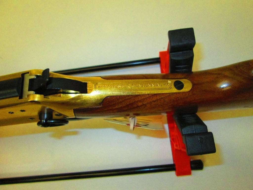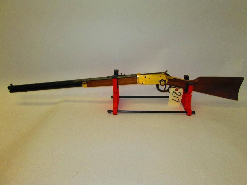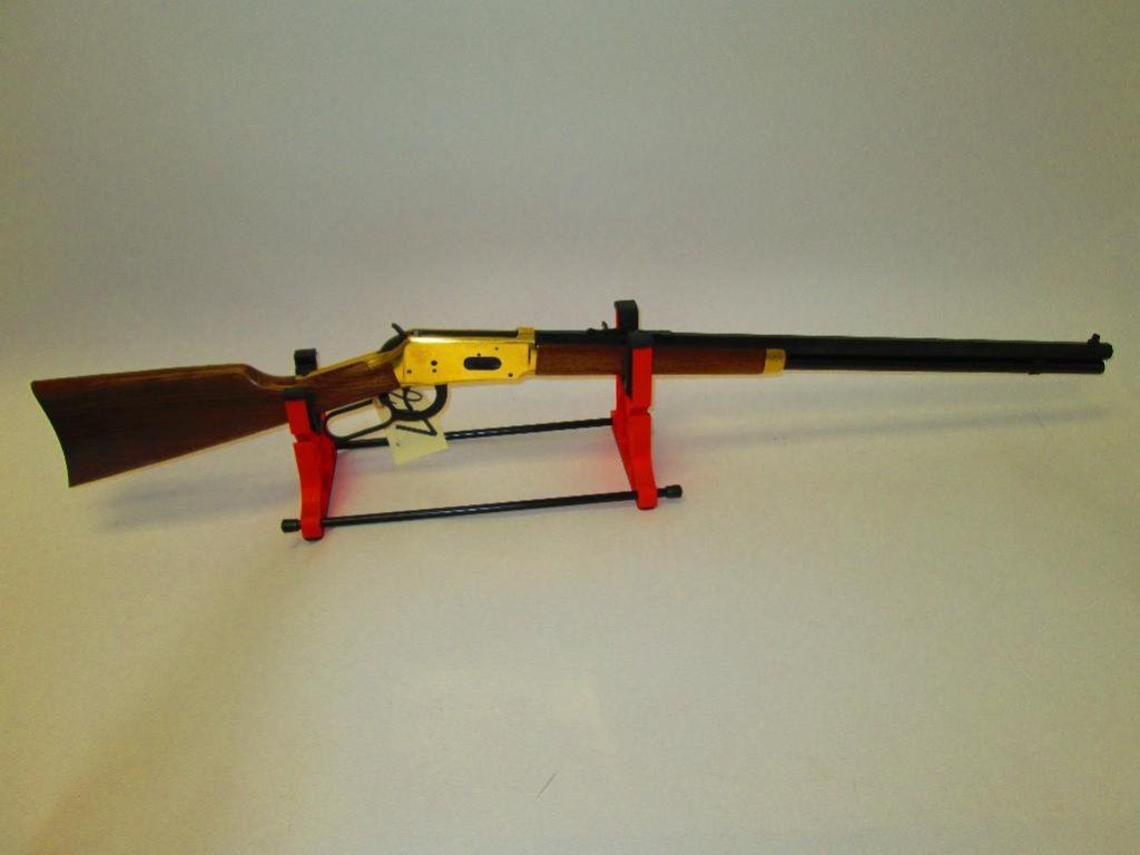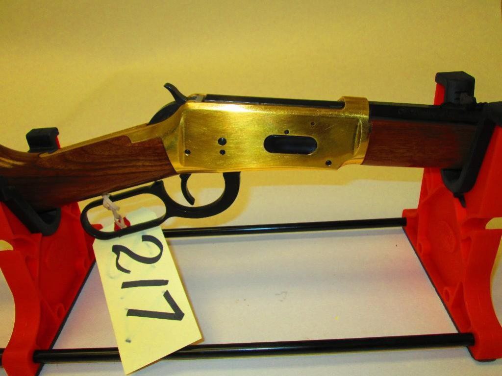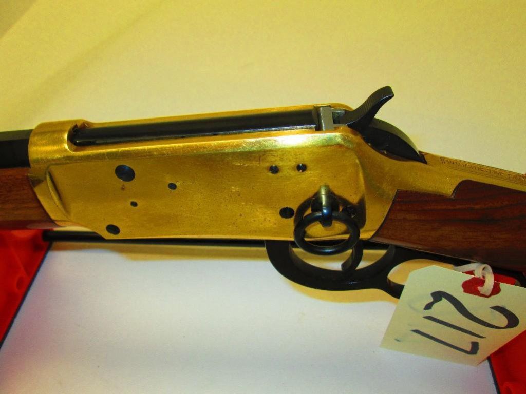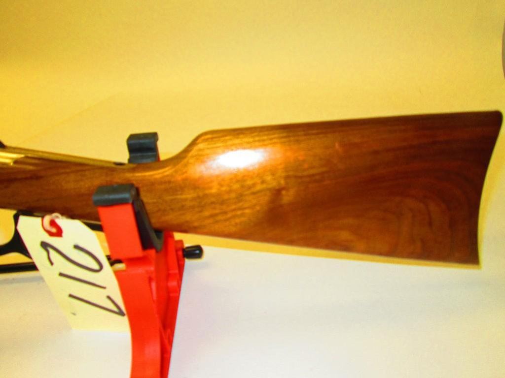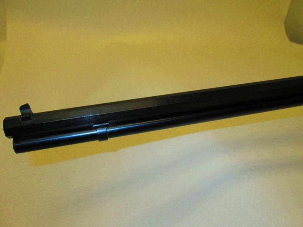 30:30. Brass plated receiver. Octagonal barrel 22" bbl. Tiny pitting on receiver. No apparent rust on the barrel. Stock is excellent.