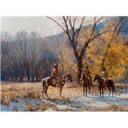 In As Seasons Change, three warriors tell time. The low angle of the sun tells one that night is coming on quicker and falling faster, that they should think about getting where they need to be before dark. The other two tell time by the length of their shadows on the dusting of snow. These signs mark the imminence of winter, despite the yellow leaves that seem to say it’s still autumn here. There are questions to ask now. Are we ready for winter? Are we camped in a good place? A safe place? A place near water? Have we hunted enough, gathered enough to last through the bitter moons? What remains to be done? What can be done in the time we have? What will have to wait? Winter won’t wait. Neither can we. This is the drama behind the dramatic light in Martin Grelle’s As Seasons Change.