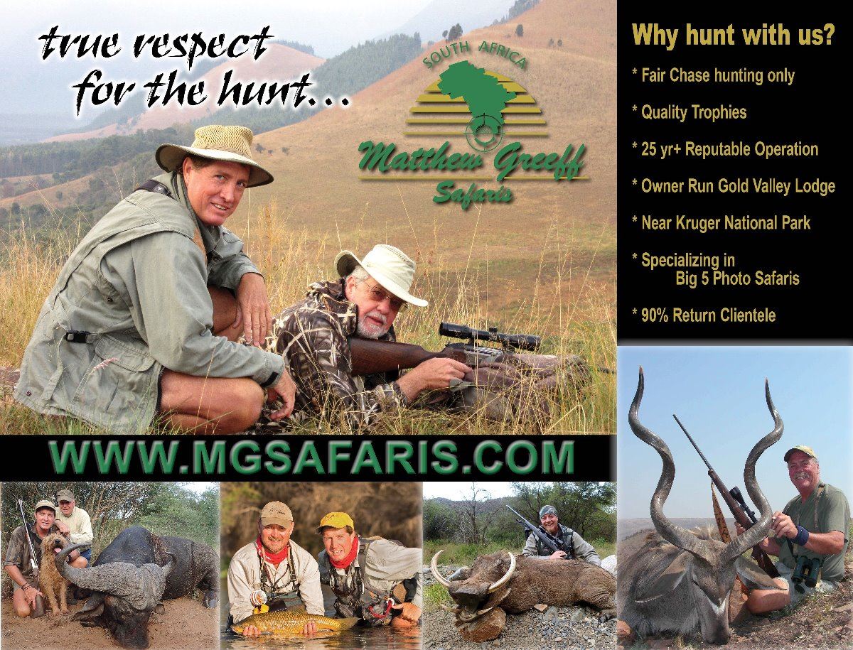 Not included are dipping, packing and shipping of trophies to US, optional pre-arranged firearm permit through PHASA office (USD $150), PHASA Fund contribution (USD $10/trophy taken), rifle rental (optional, USD $60/day, including ammunition), alcohol at cost and gratuities. Arrival/departure point is Kruger Mpumalanga International Airport,Nelspruit. For more information on this specialized safari please meet with Gray and Kelli Thornton or Savannah Greeff at GOBC event or contact Matthew or Sylvia Greeff by phone/fax at Int. 27 83 2652824, or by email at mgsafari@iafrica.com. Company's Website: www.mgsafaris.com