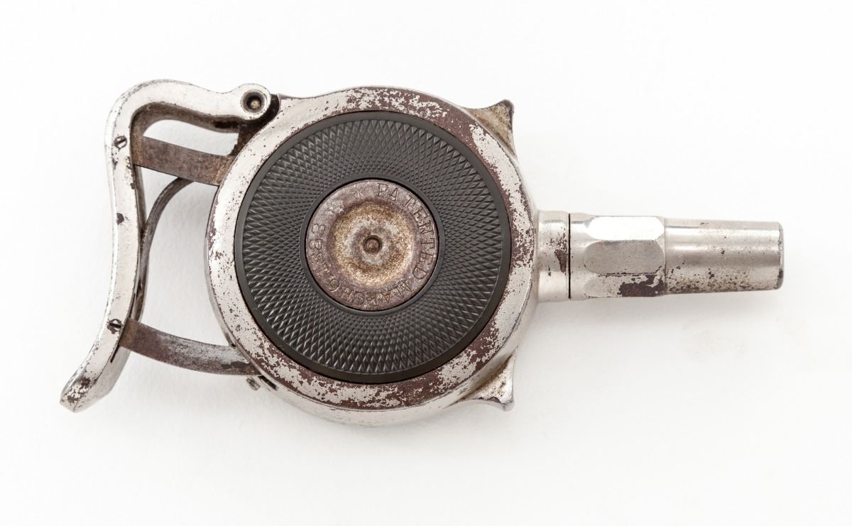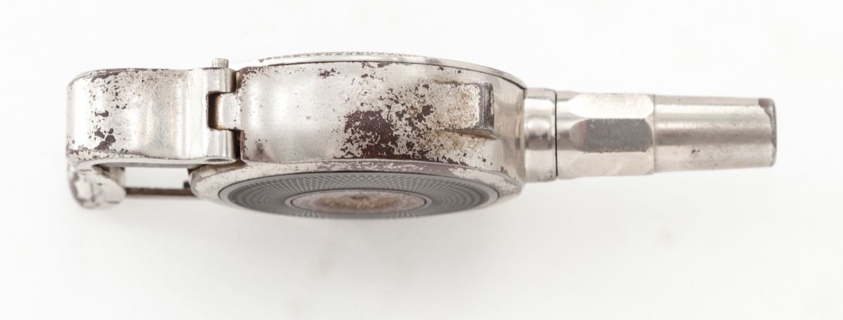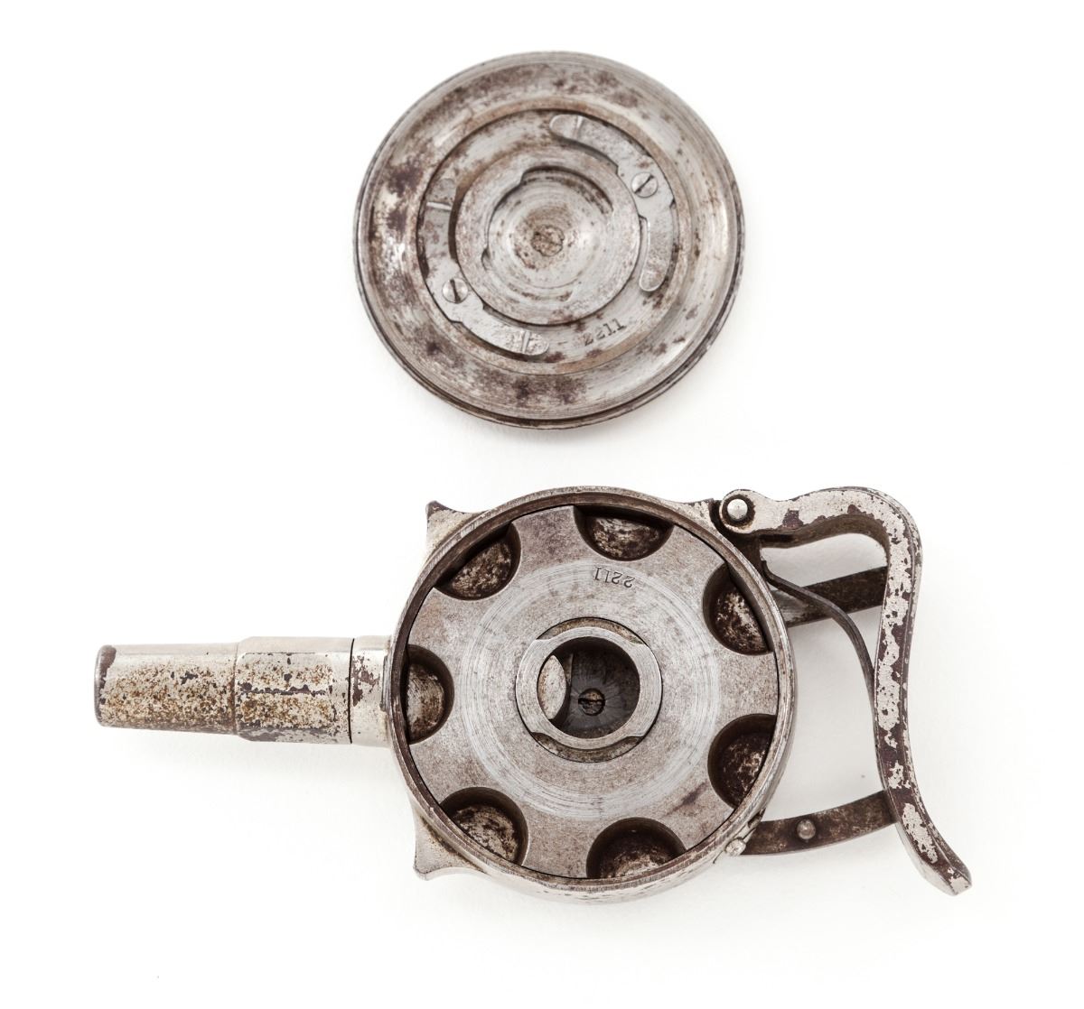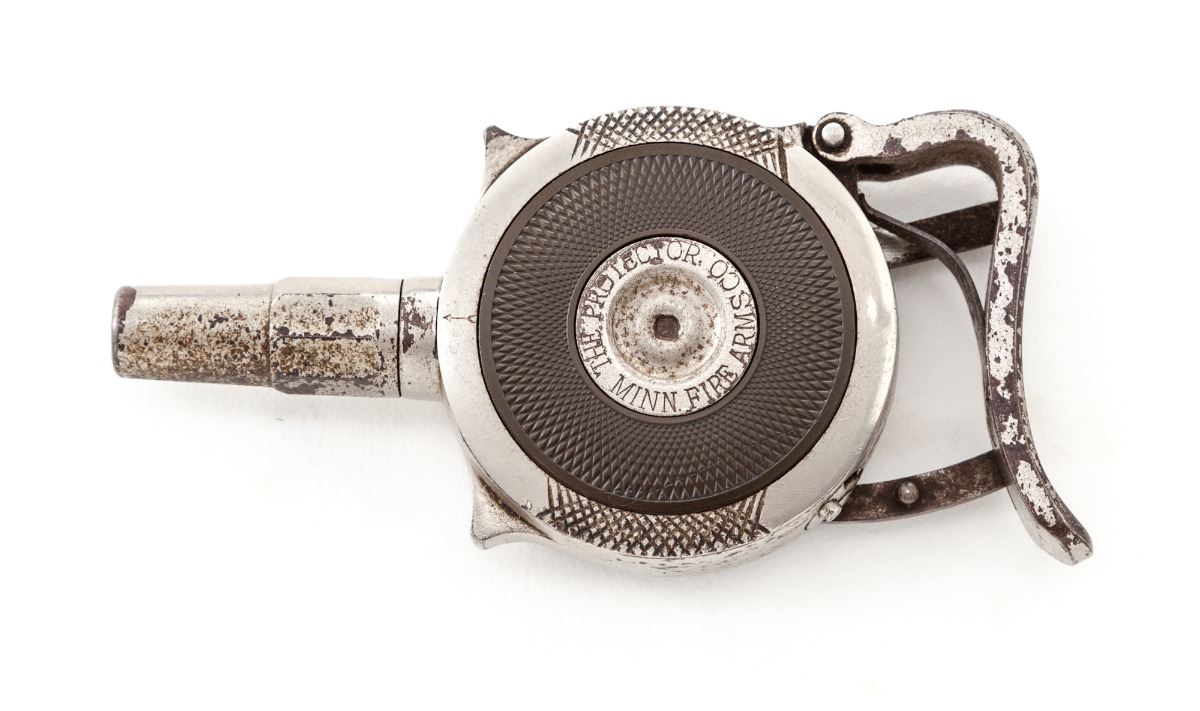 ''The Protector'' Palm Pistol, by Minn. Firearms Co., #2211, .32 Short RF cal., 1-3/8'' barrel, nickel finish, checkered hard rubber circular panels. Minnesota Firearms variation with safety to backstrap beneath squeeze lever. Condition is very good retaining approx. 85%-90% flaking nickel. Hard rubber grip panel was not supplied on this variation. Action is good, bore is fair. Est.: $800-$1,200. (Antique)