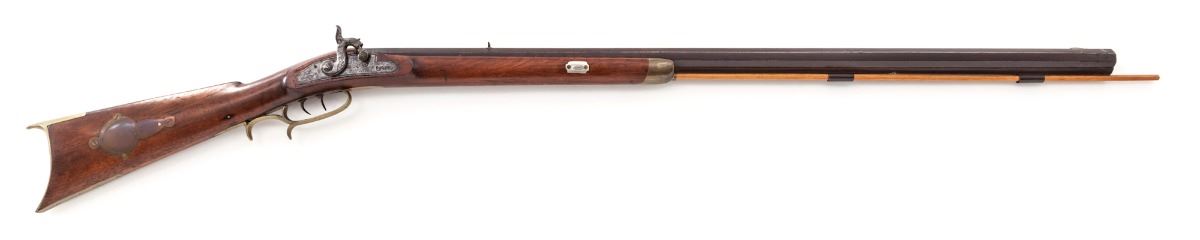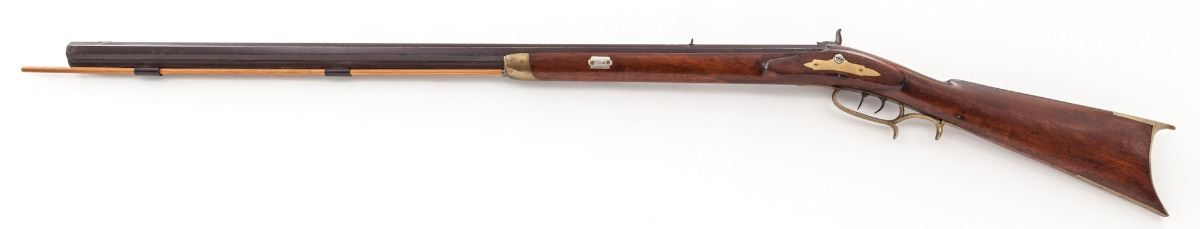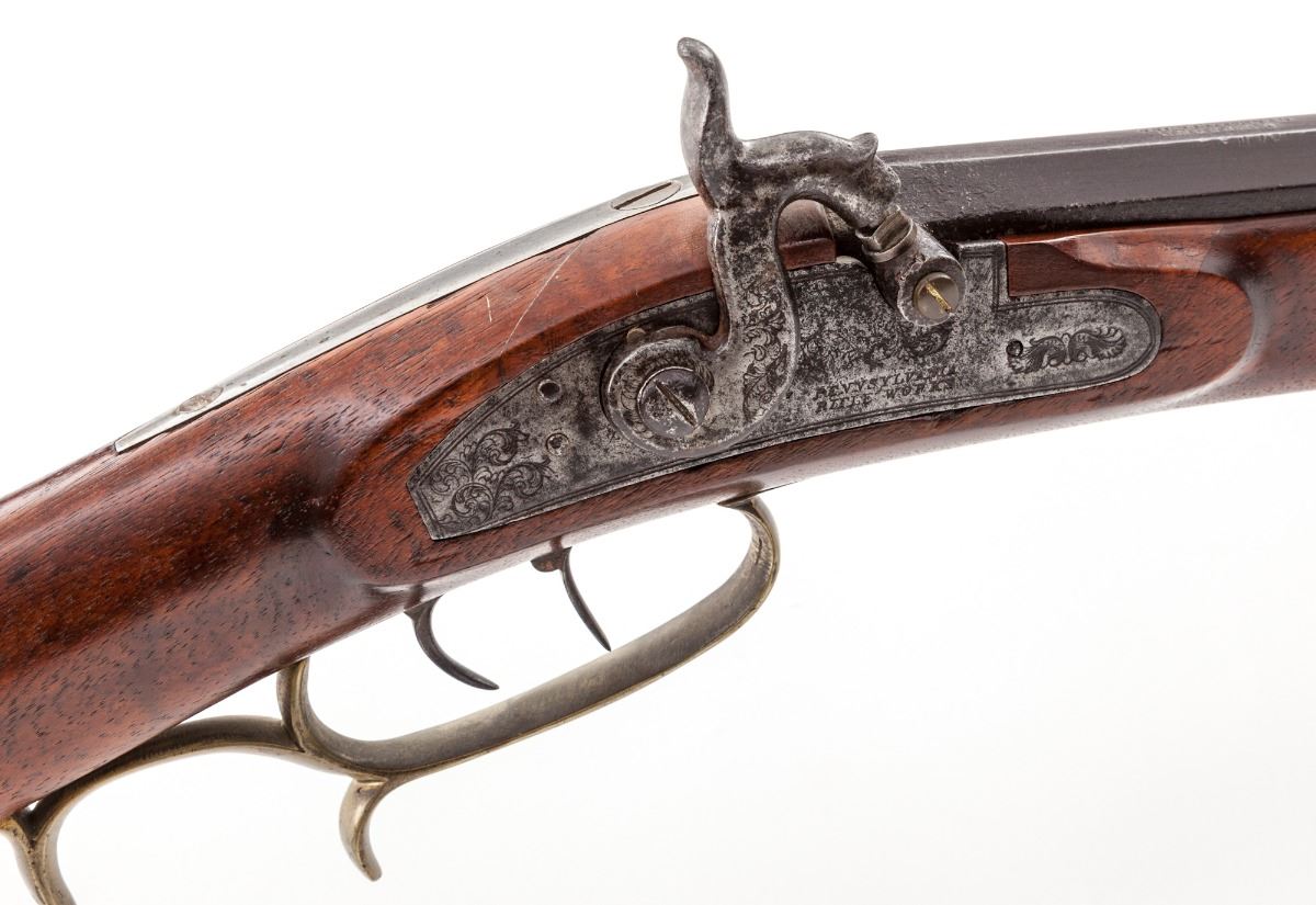 Mid-19th Century Halfstocked Plains Rifle, by C. Keller, Evensville, Ind., .36 cal., 36'' octagonal barrel, brown finish, walnut halfstock, double set trigger, with brass hardware. Lock marked ''Pennsylvania Rifle Works''. Brass hardware and patchbox. Condition is fine. Barrel retains approx. 75%-80% blue/brown finish, with several nicks near German silver rear sight and some replaced screws. Stock shows sanding and re-varnishing over very light scuffs and some oil darkening near pins. Functioning double set triggers. Action and bore are good. Est.: $600-$800. (Antique)