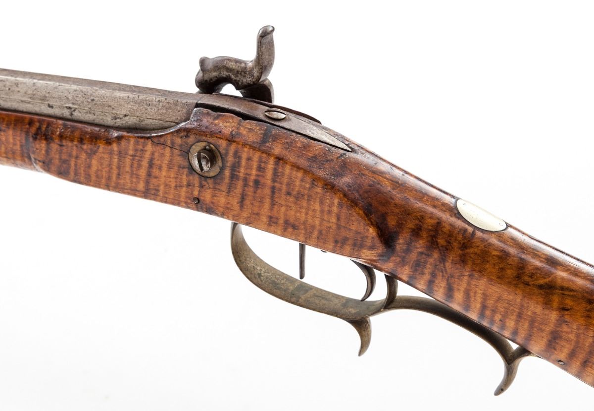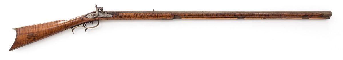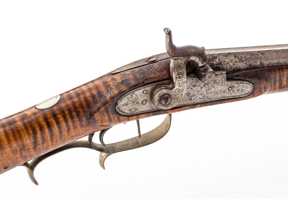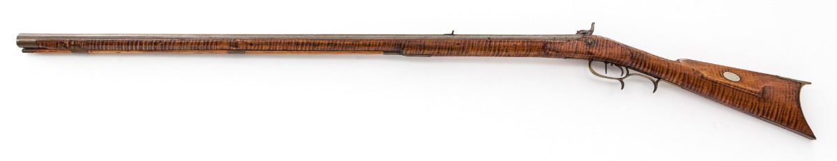 Batchelor & Brother marked Kentucky Type Percussion Long Rifle, .36 cal., 41'' octagonal barrel, tradelock and hammer with light engraving, set trigger, brass buttplate, triggerguard, ramrod ferrules and forend tip; with heat-striped walnut stock having two nickel silver oval escutcheons, one at wrist and one at cheek. Ca. 1835-1860. Condition is very good. Exterior surfaces of barrel has been cleaned at one point, and showing moderate corrosion near nipple bolster and lockplate. Stock with minor repair below hammer and small fissure at lockplate screw. Action needs adjustment, bore is good. Est.: $500-$750. (Antique)