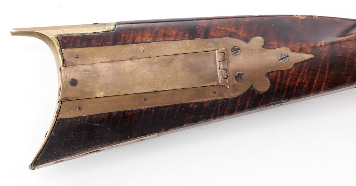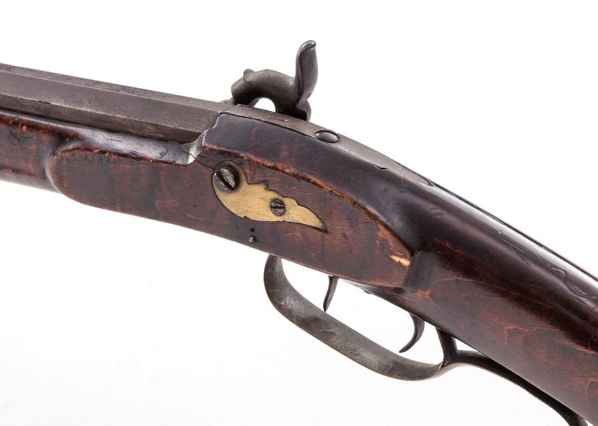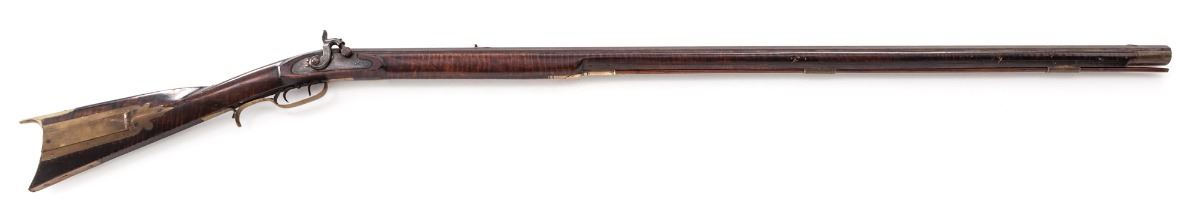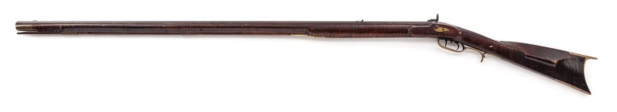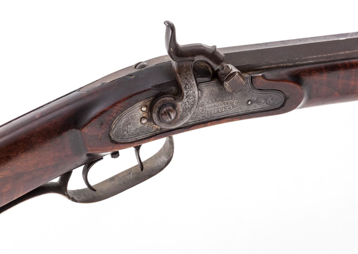 Pennsylvania made Kentucky Percussion Long Rifle, .36 cal., 44-1/4'' octagonal barrel, brown finish, full-length tiger-striped walnut stock, working double set trigger, front muzzle flat decorated with four concentric circles and eight stars, brass hardware including an unadorned Leman style patchbox, with lock marked ''Bown & Tetley, Warranted, Pittsburgh'', and light engraving showing hunter in field, as well as light treatment scroll work to sideplate and hammer. Top barrel flat marked ''ABS'' in cursive letters behind rear sight. Condition is very good to near fine with light to just moderate silvery gray patina. Stock shows moderate scuffs and scratches, light knackering, and one small fracture to right side just above patchbox. Action is good, bore is fair. Est.: $1,000-$1,500. (Antique)