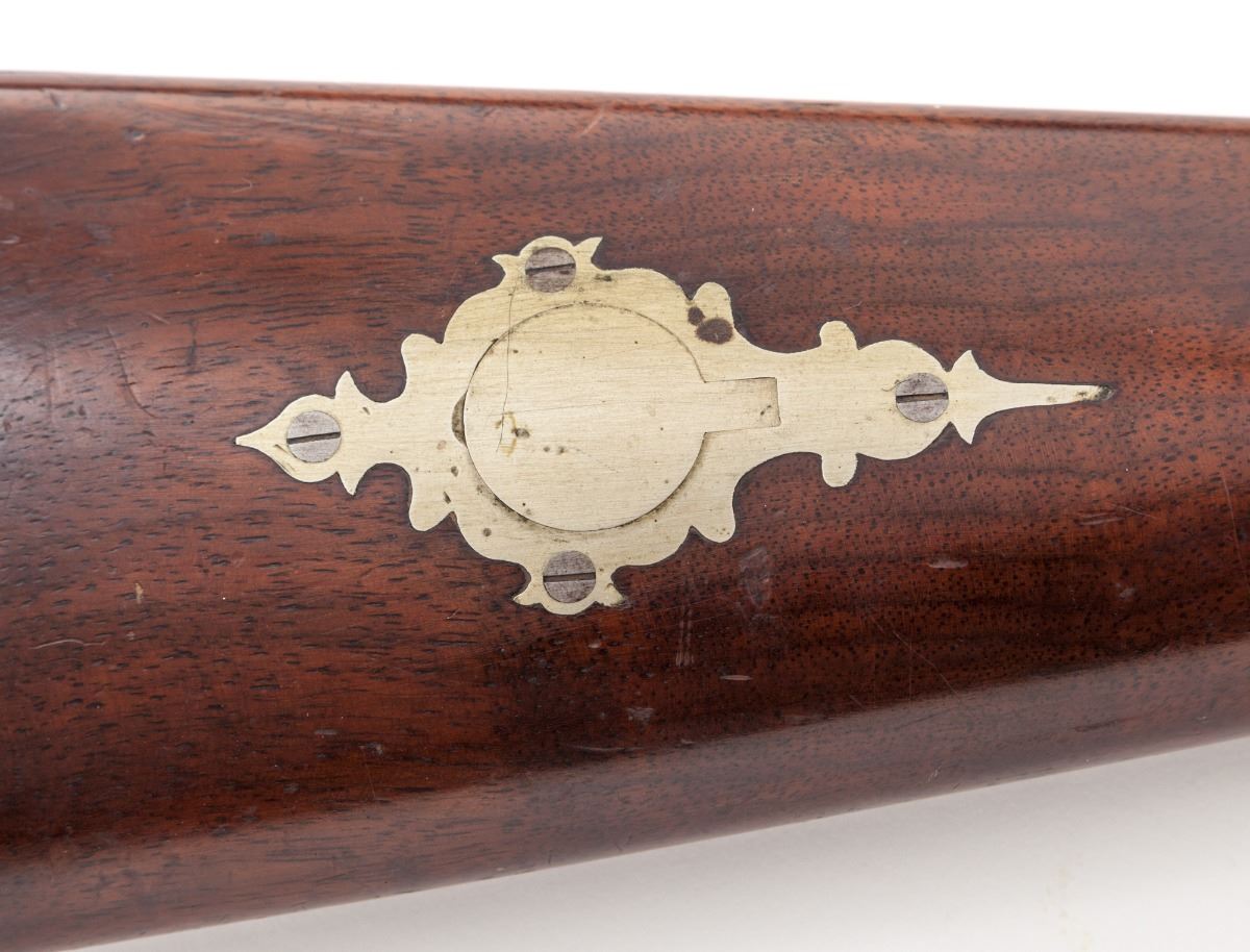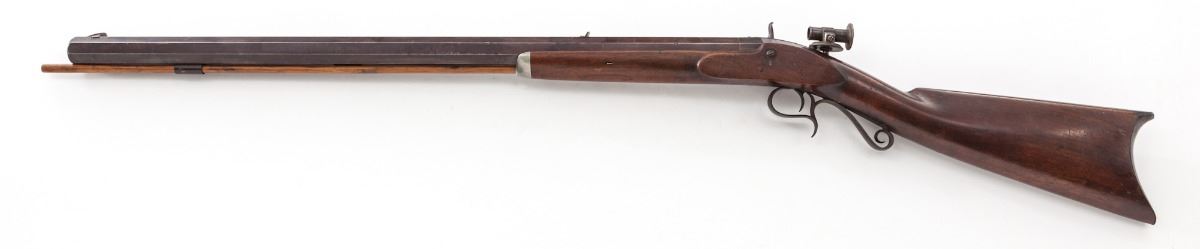 New York made Percussion Target Rifle, by E.W. Cook, Lockport, NY, #684, .40 cal., 28'' medium-weight barrel marked ''Cast Steel'', brown and case hardened finish, perchbelly walnut halfstock, with German silver patchbox to right side, period hooded tang peep sight, Rocky Mountain style front sight, with hand-inscribed sight index mark to top of barrel flat at beveled muzzle. Condition is very good. Barrel retains approx. 60%-70% of its original brown color. Case colors to trade lock have toned mostly silvery gray. Stock with light pressure dings and minor scuffs, one professionally accomplished repair to left side near breech plug. Hickory ramrod appears to be a later replacement. Est.: $800-$1,200. (Antique)